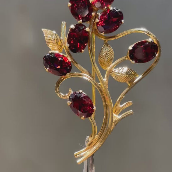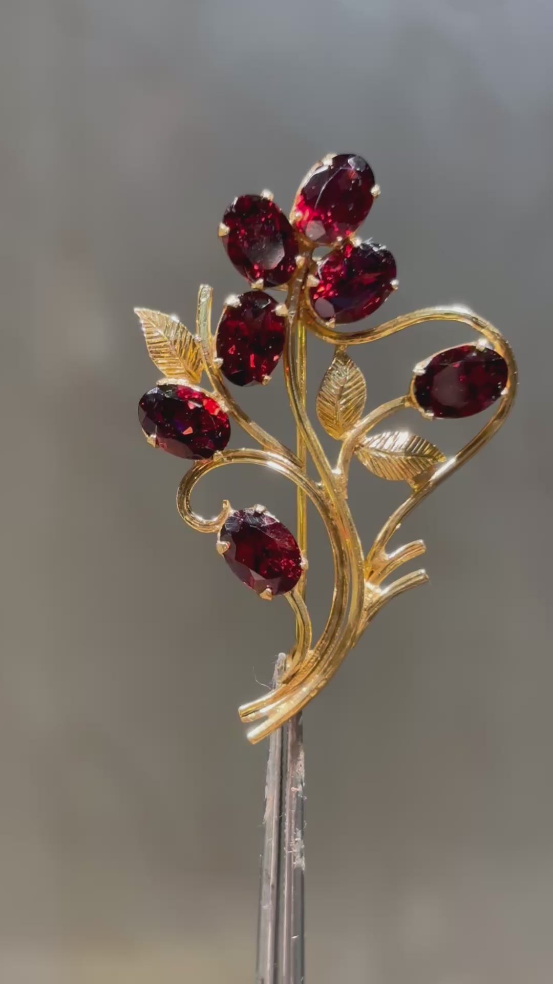 This exquisite 18kt gold brooch features a delicate floral design adorned with stunning garnet gemstones. The 18kt gold adds a touch of luxury and elegance to this timeless piece, making it the perfect addition to any jewelry collection. A must-have for any fashion-forward individual.