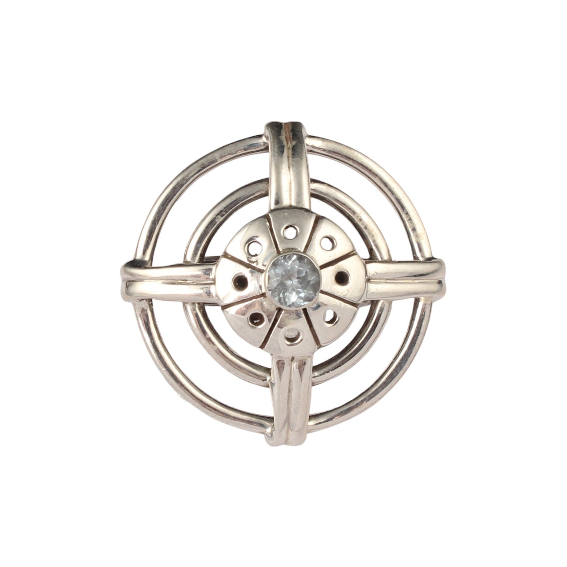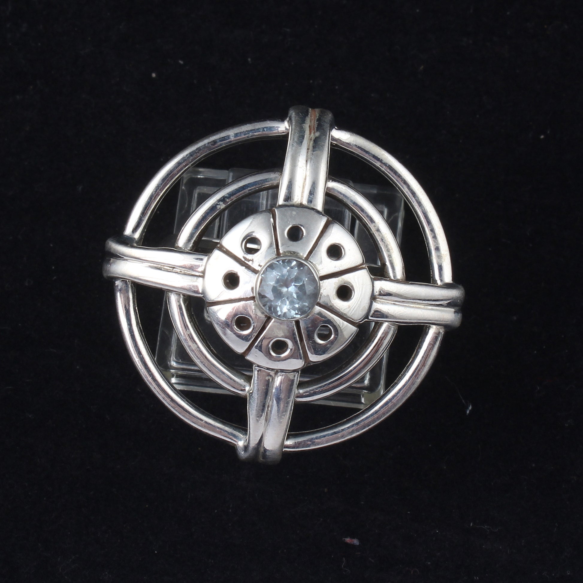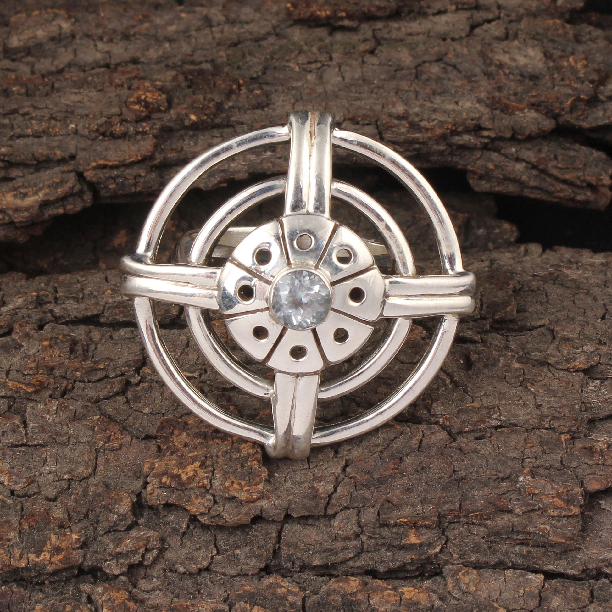 Crafted in 925 sterling silver, this statement ring features a natural 5mm round Blue Topaz gemstone, weighing 12.33 grams. Its geometric design highlights the stone’s vibrant blue hues, offering a refined blend of elegance and contemporary style. Ideal for those seeking expert craftsmanship and timeless jewelry with a distinctive character.