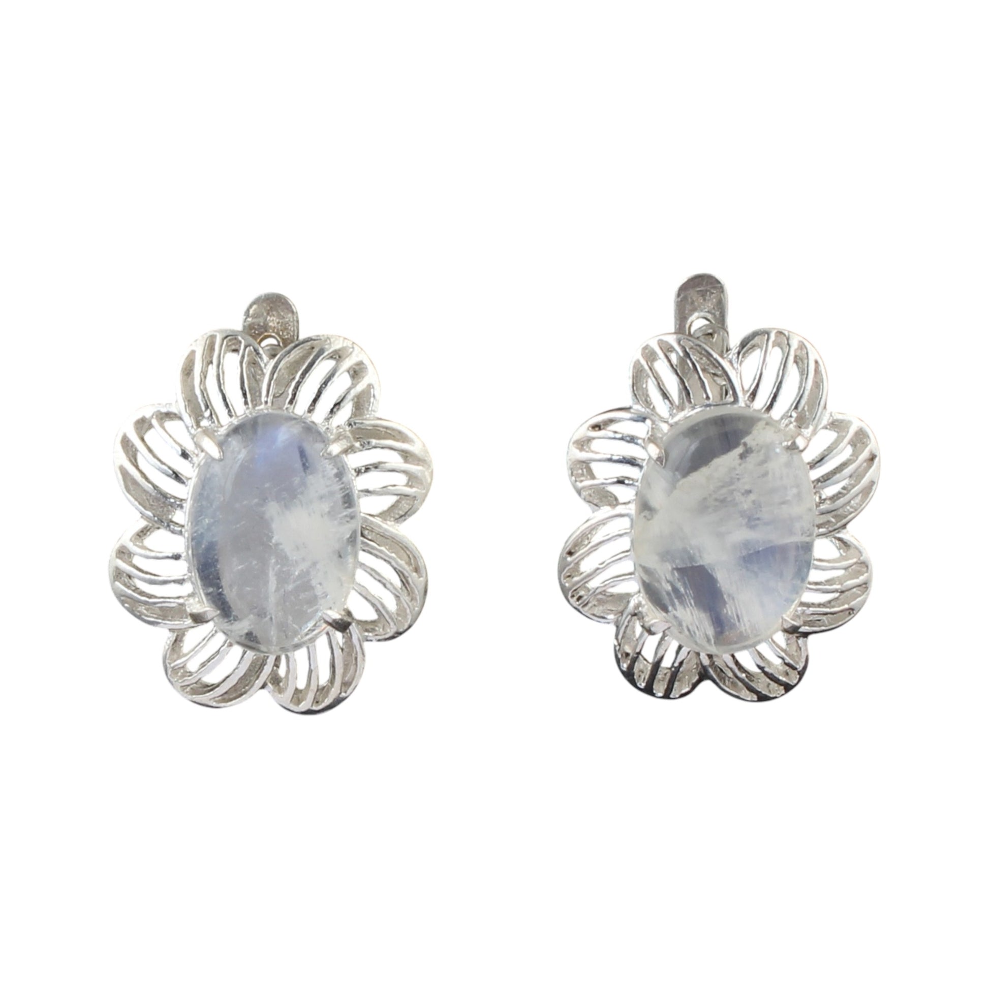 These Bohemian Rainbow Moonstone Earrings showcase expertly handcrafted 925 sterling silver settings that highlight the unique, ethereal glow of each 14x10mm round stone. Measuring 2.3 by 1.8 cm and weighing 8.9 grams, they offer an elegant balance of size and comfort. Ideal for those who appreciate artisanal jewelry with a mystical charm, these earrings provide a subtle yet striking addition to any collection.