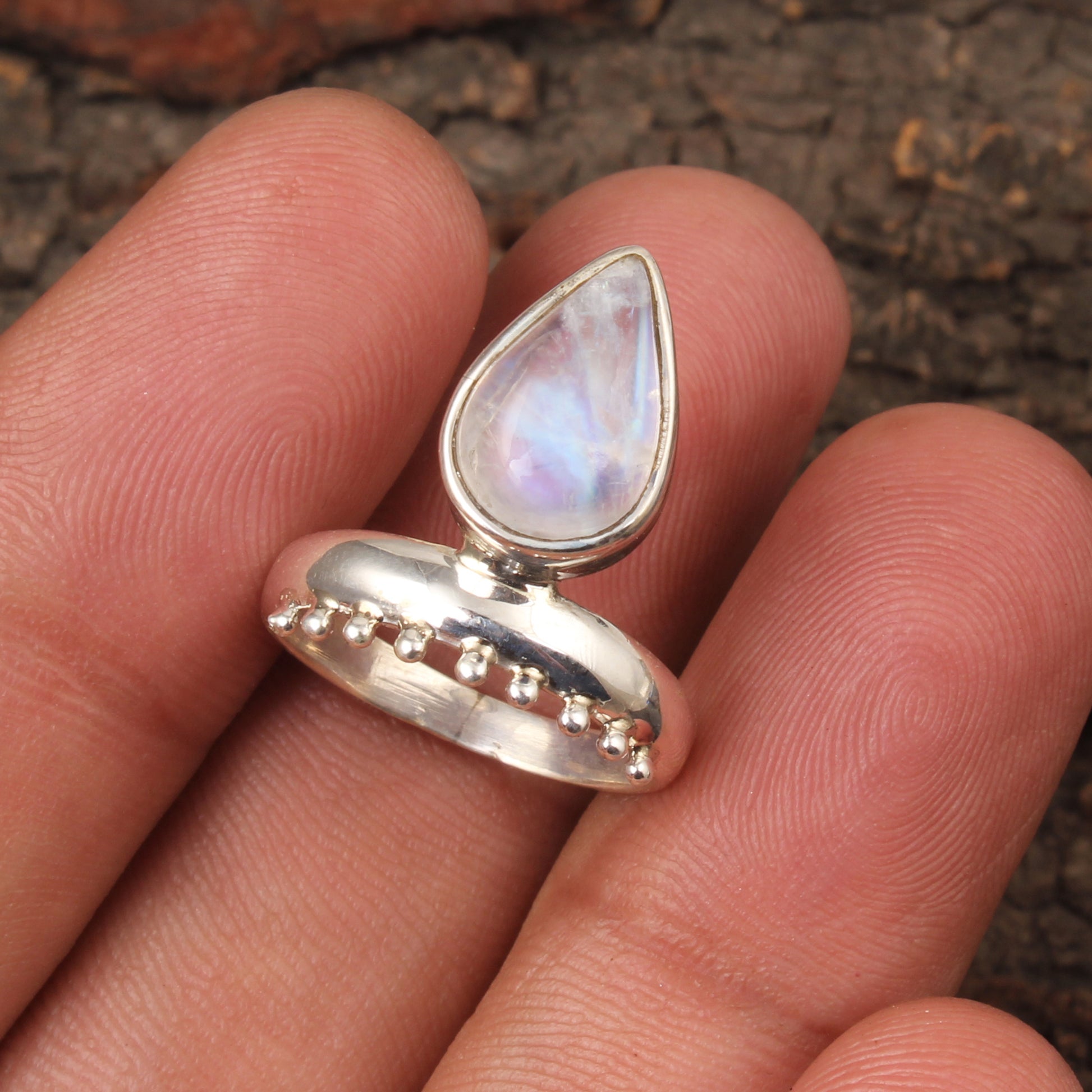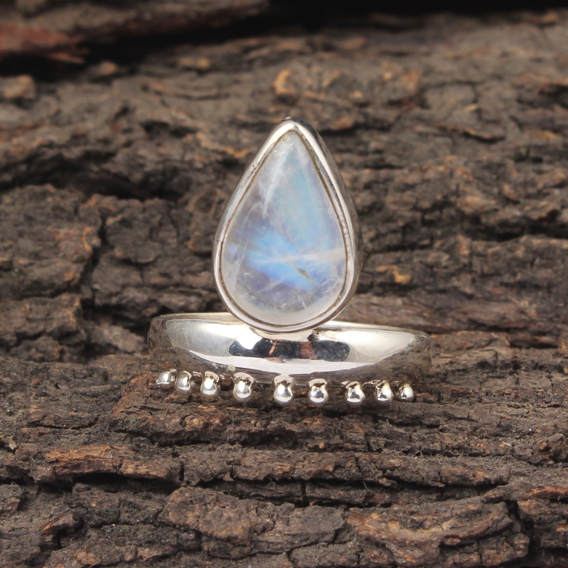 Boho Style Pear Shaped Rainbow Moonstone Ring with Decorative Band Handmade 925 Sterling Silver Ring