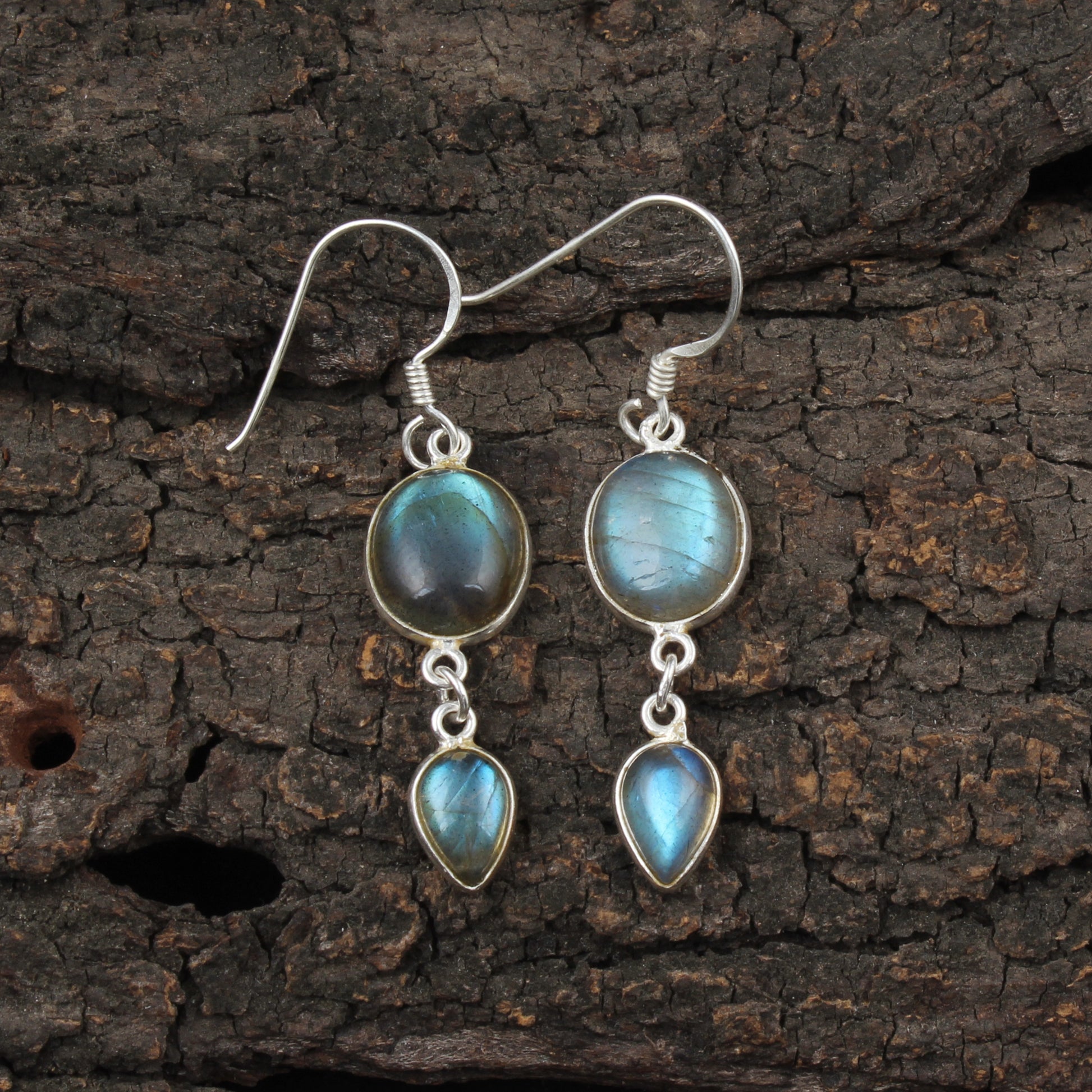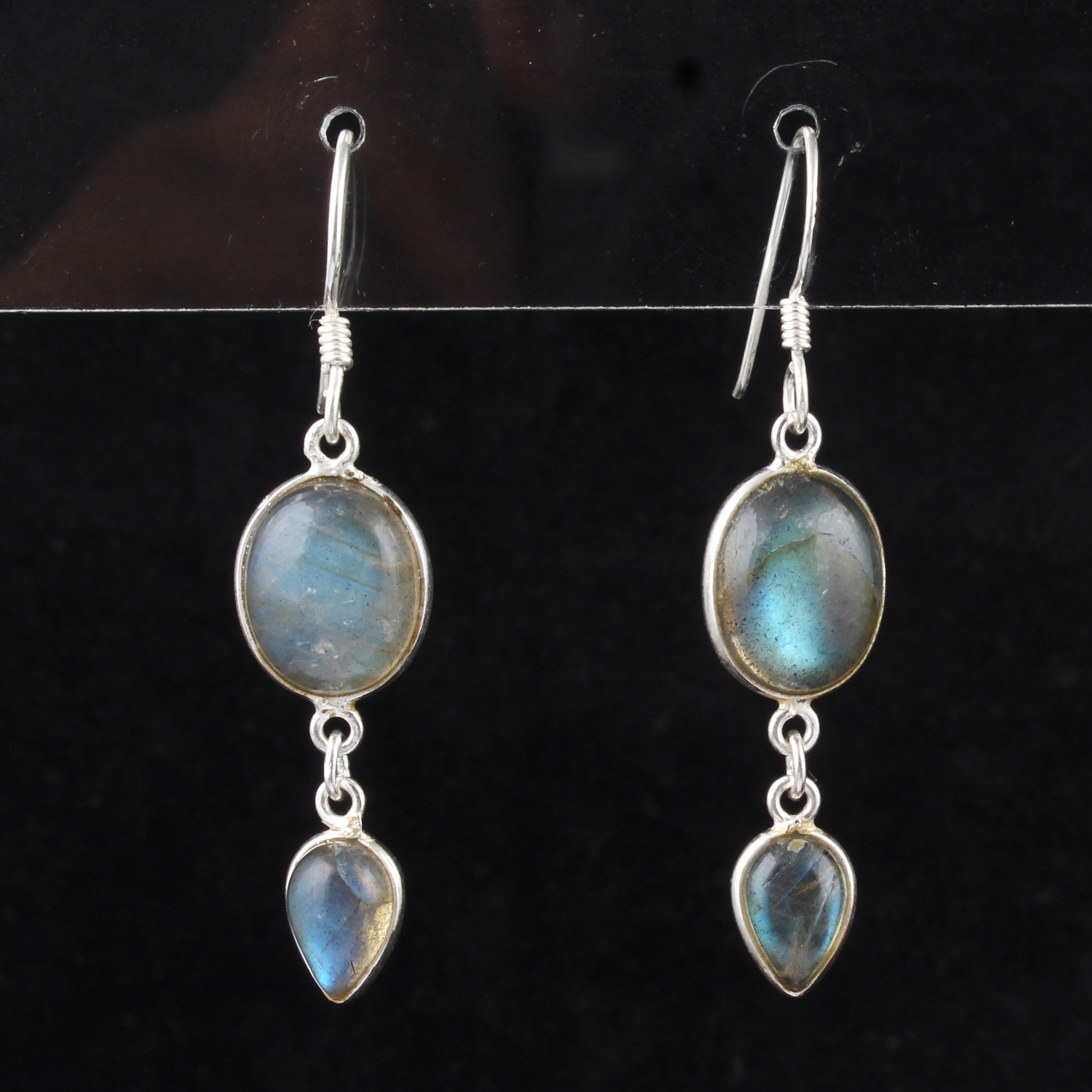 Crafted with precision, these dangle earrings showcase natural labradorite stones measuring 11x9mm and 9x6mm in elegant oval and pear shapes. Set in handmade 925 sterling silver bezels, each earring measures 4.7 x 1 cm and weighs 3.82 grams, offering a refined balance of durability and lightweight comfort. Ideal for adding a subtle yet captivating shimmer to professional or formal attire.