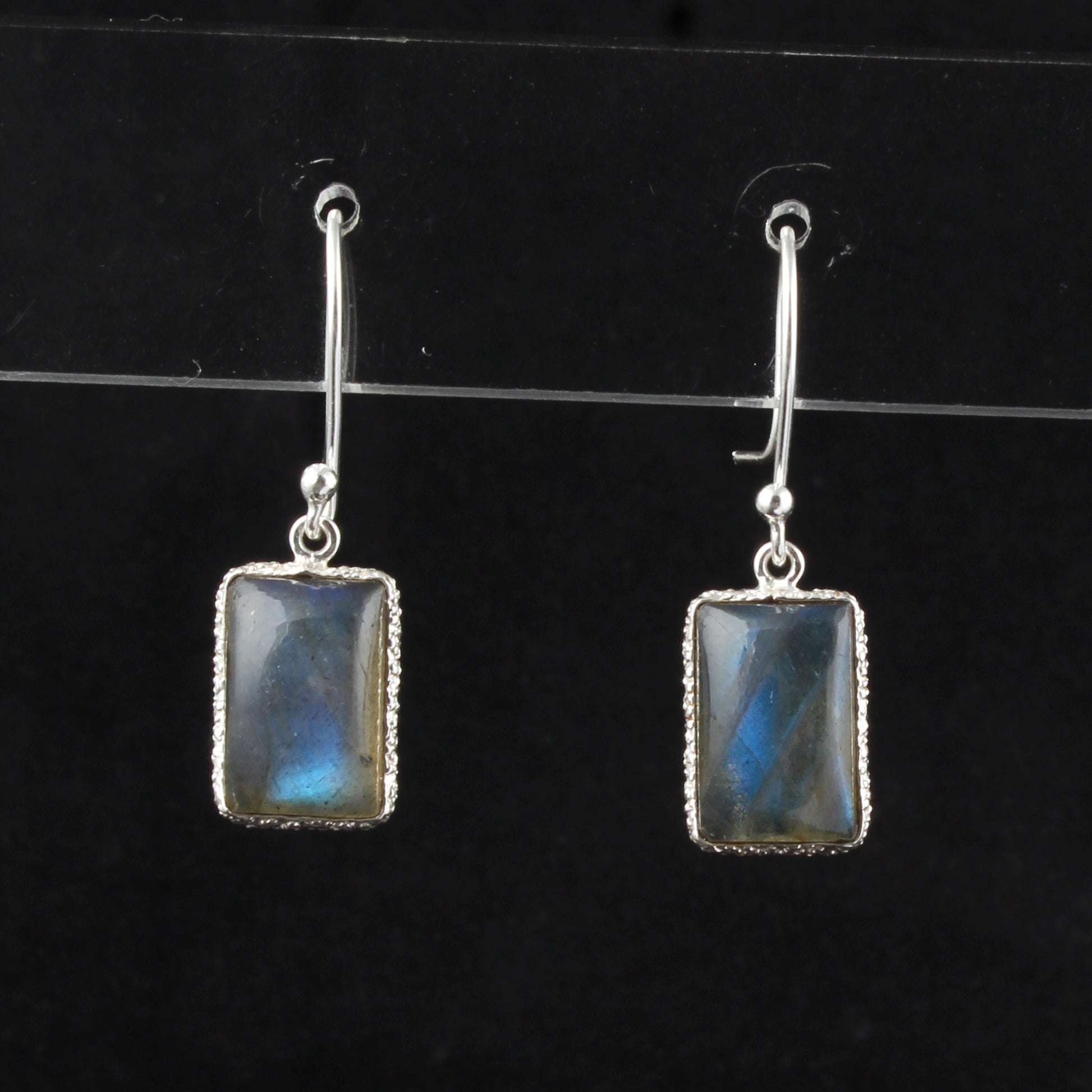 These dangle earrings feature natural labradorite gemstones set in a textured bezel crafted from 925 sterling silver. Each rectangular stone measures 13x9mm, perfectly sized at 3.2 x 1 cm for an elegant yet versatile look. Weighing just 3.85 grams, they balance lightweight comfort with quality craftsmanship, making them a refined choice for those seeking distinctive gemstone jewelry with durable sterling silver settings.
