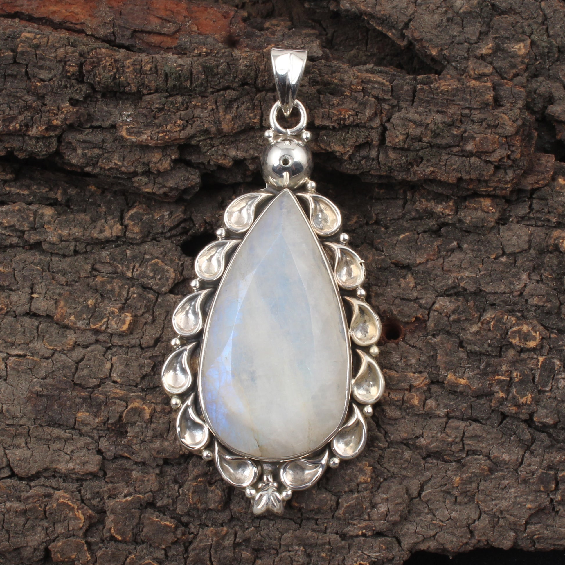 This handmade pendant features a natural pear-shaped Rainbow Moonstone measuring 65x31mm and weighing 20.05 grams, set in 925 sterling silver. Known for its ethereal shimmer, the Rainbow Moonstone offers a captivating play of light, perfect for adding a subtle yet striking touch to any ensemble. Expertly crafted, this designer boho piece balances elegance and natural beauty, making it an exceptional choice for those who appreciate both quality and distinctive style.