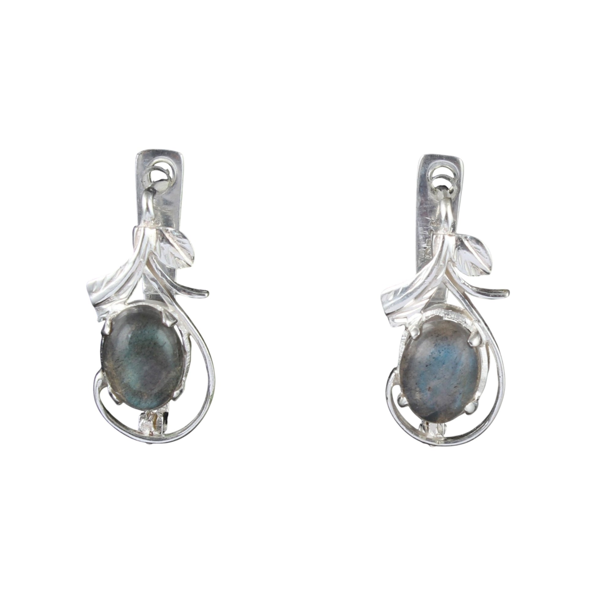 These handcrafted designer earrings feature genuine labradorite gemstones set in an elegant leaf charm design. Made from 925 sterling silver, each earring showcases a 9x7mm oval labradorite stone that exhibits a captivating play of colors. Measuring 2.6 x 1.2 cm and weighing 5.17 grams, they combine refined craftsmanship with a natural gemstone’s unique allure, perfect for those seeking both quality and distinctive style.