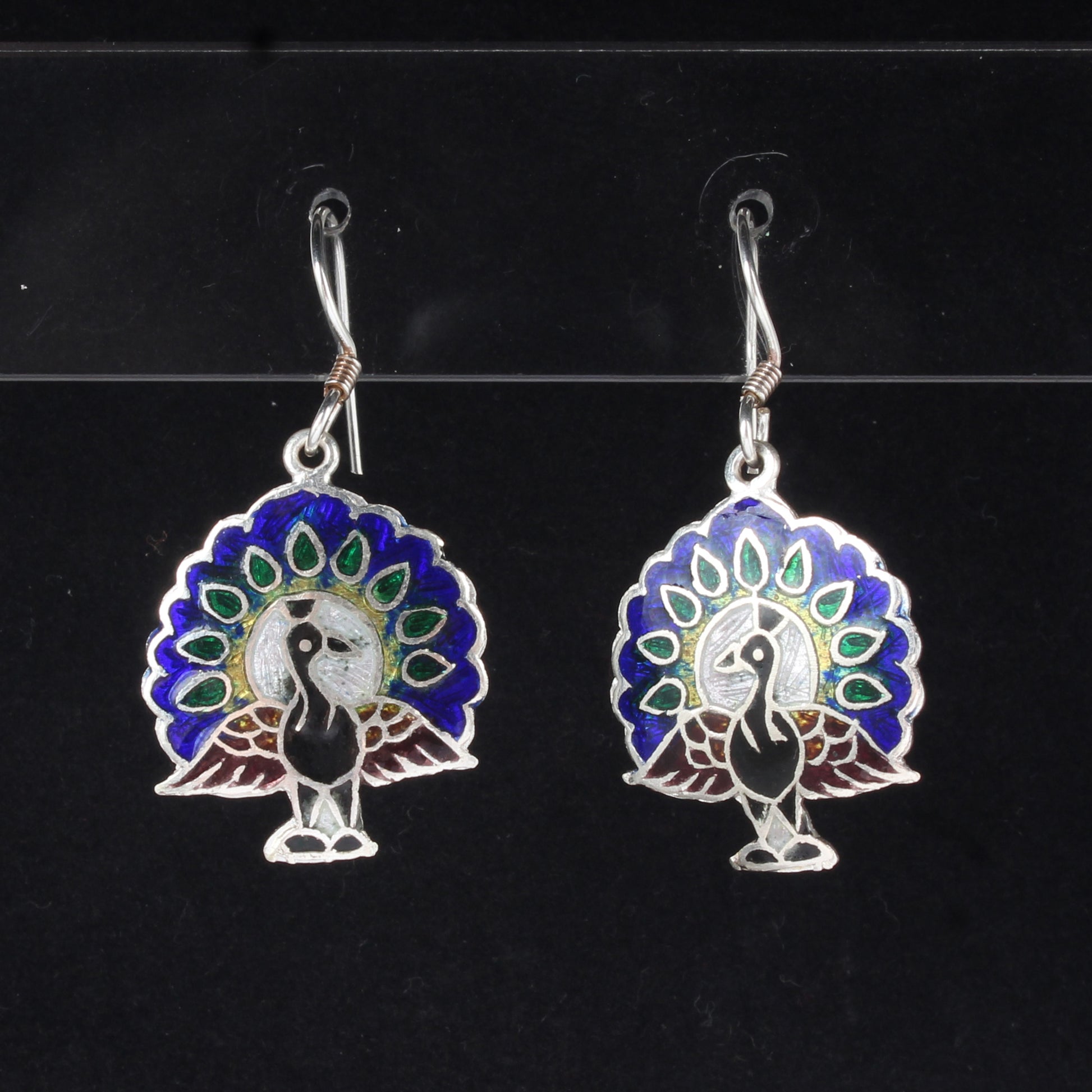 Designer Peacock Enamel Silver Earrings Solid 925 Sterling Silver Dangle Earrings Ear Wire Colorful Enamel Earrings