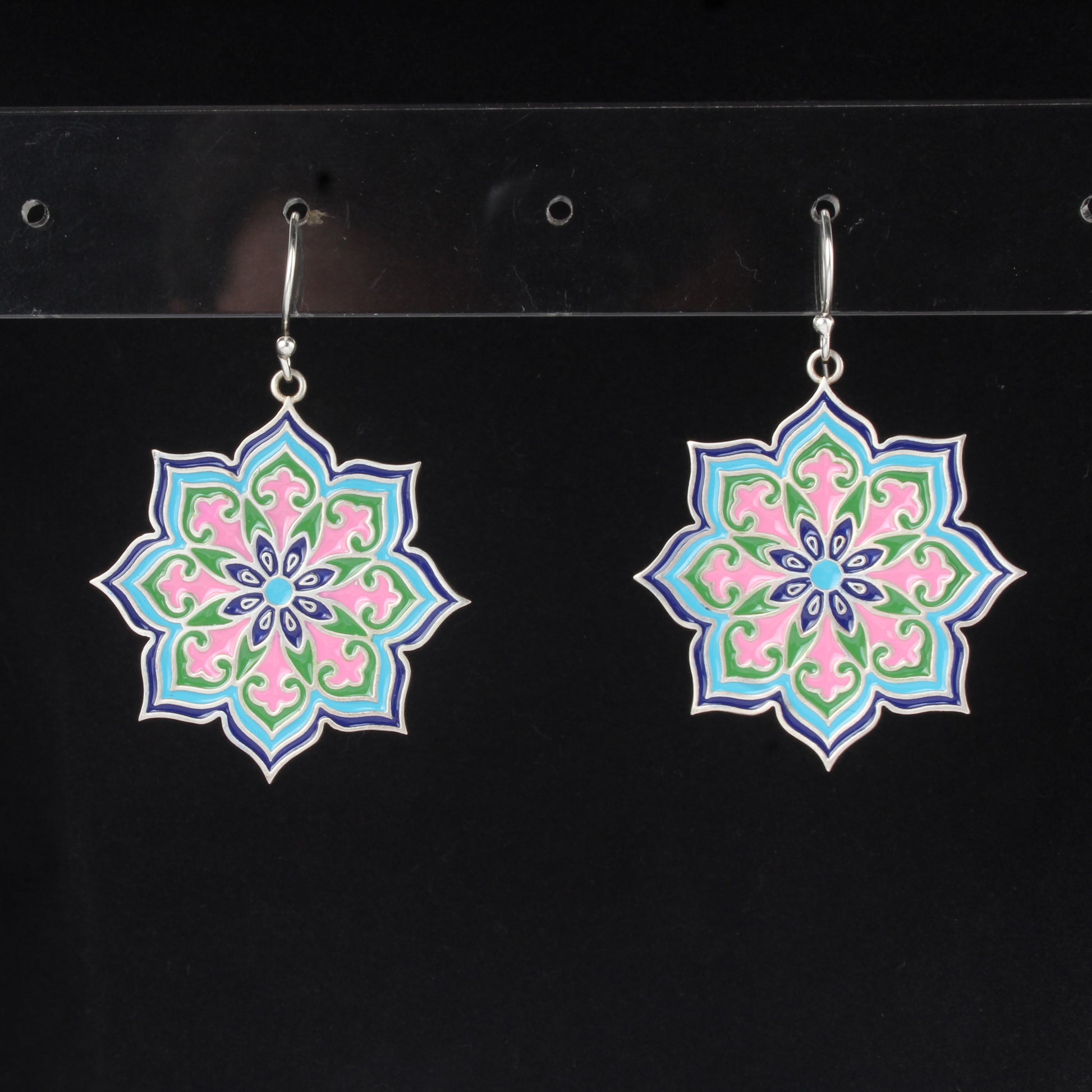 Crafted from solid 925 sterling silver, these enamel dangle earrings feature a vibrant, colorful design that adds a refined touch to any outfit. Measuring 2.2 inches in length and weighing 15.18 grams, they offer a comfortable yet substantial feel. The ear wire ensures secure wear while showcasing expert craftsmanship, making these earrings ideal for those seeking both quality and style in their jewelry collection.
