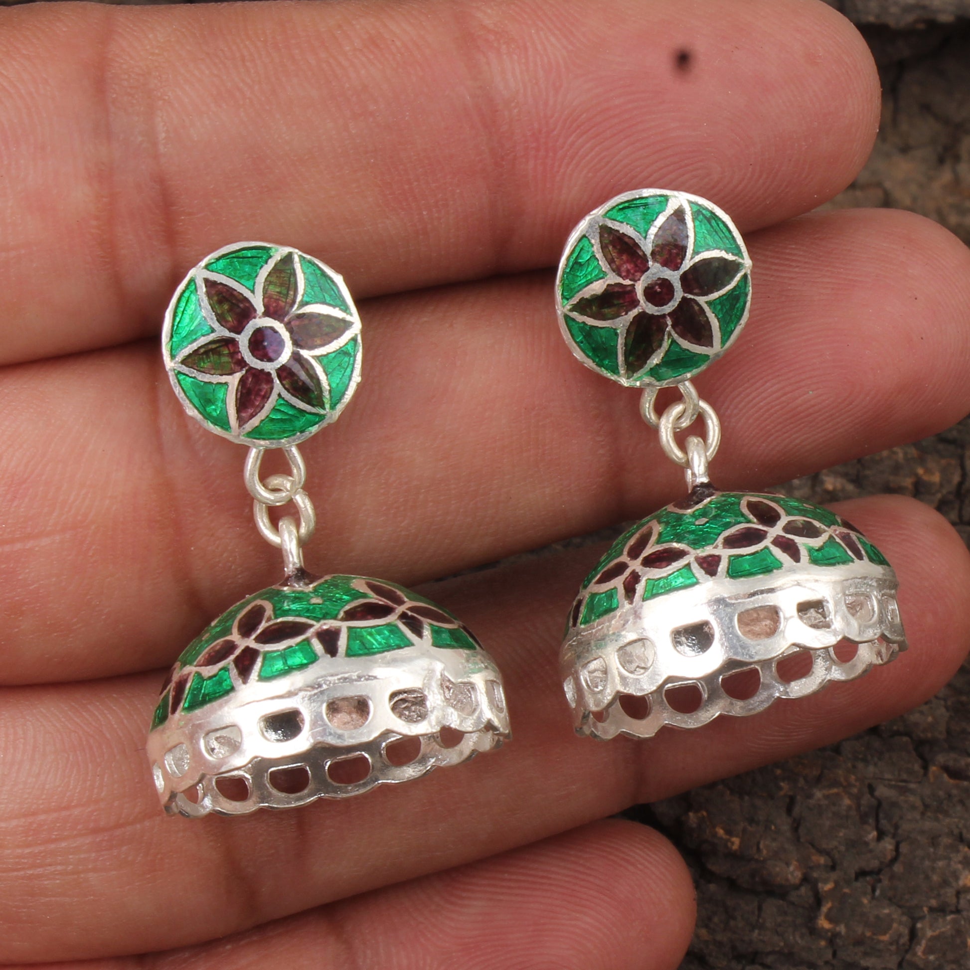 Ethnic Wear Jhumka Dangle Earrings Handmade 925 Sterling Silver Meenakari Enamelled Earrings