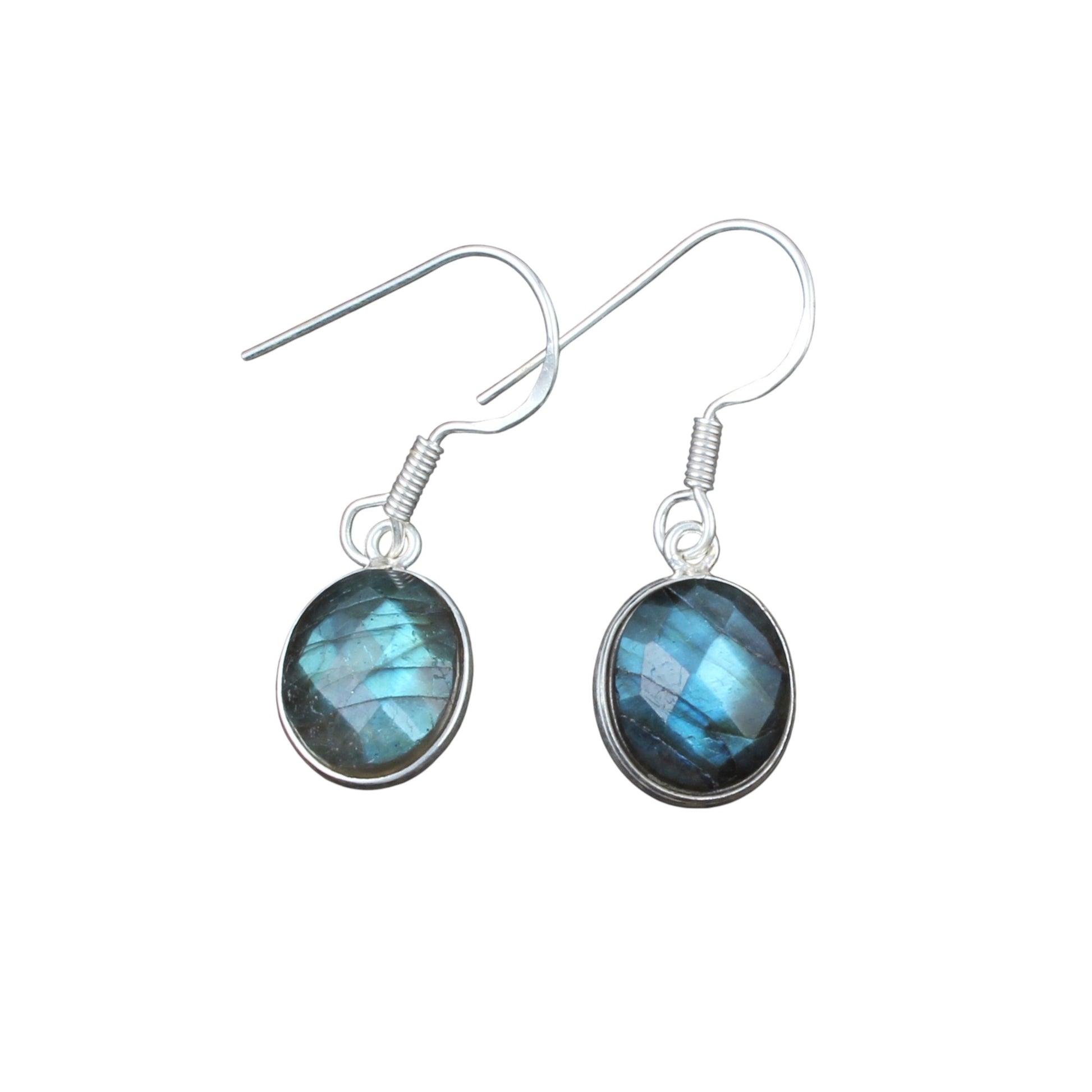 Expertly crafted, these faceted Labradorite earrings feature 11x9mm oval stones set in handmade bezels of 925 sterling silver. Measuring 3 x 1 cm and weighing 2.48 grams, they combine lightweight comfort with the captivating shimmer of Labradorite. Ideal as a sophisticated birthday gift, these earrings showcase the natural beauty and unique play of colors characteristic of this prized gemstone.