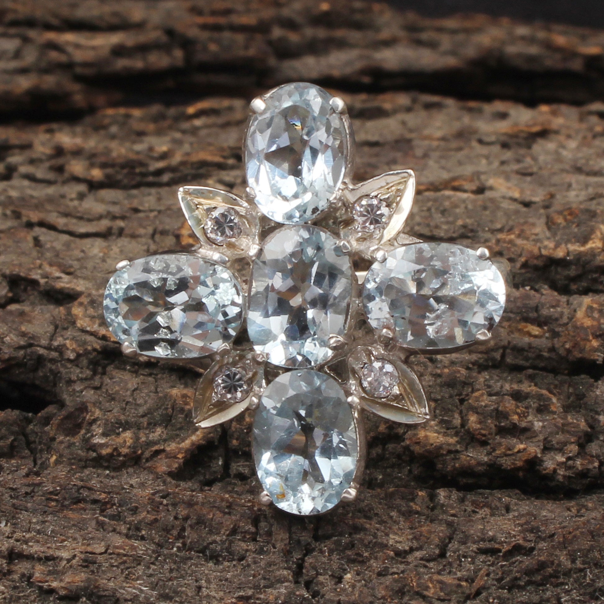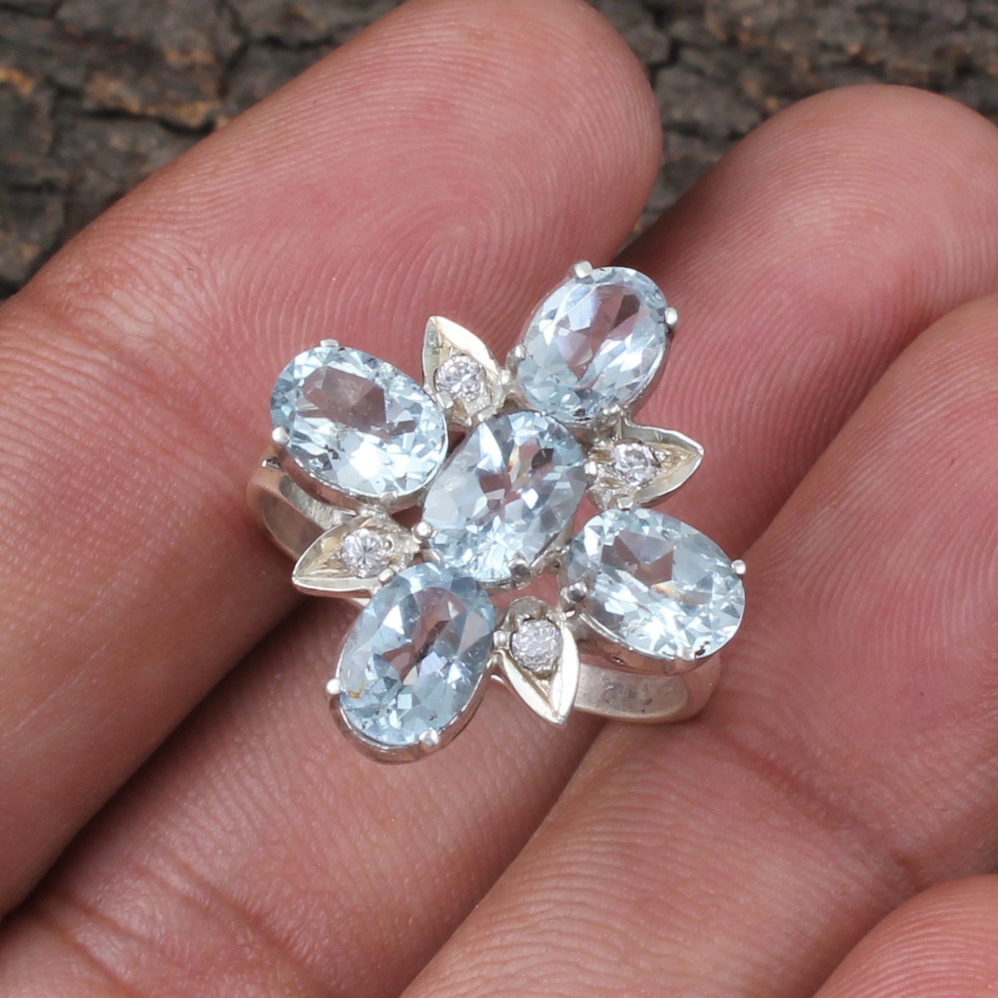 Floral Blue Topaz Ring with CZ Handmade 925 Sterling Silver Designer Cluster Ring December Birthstone