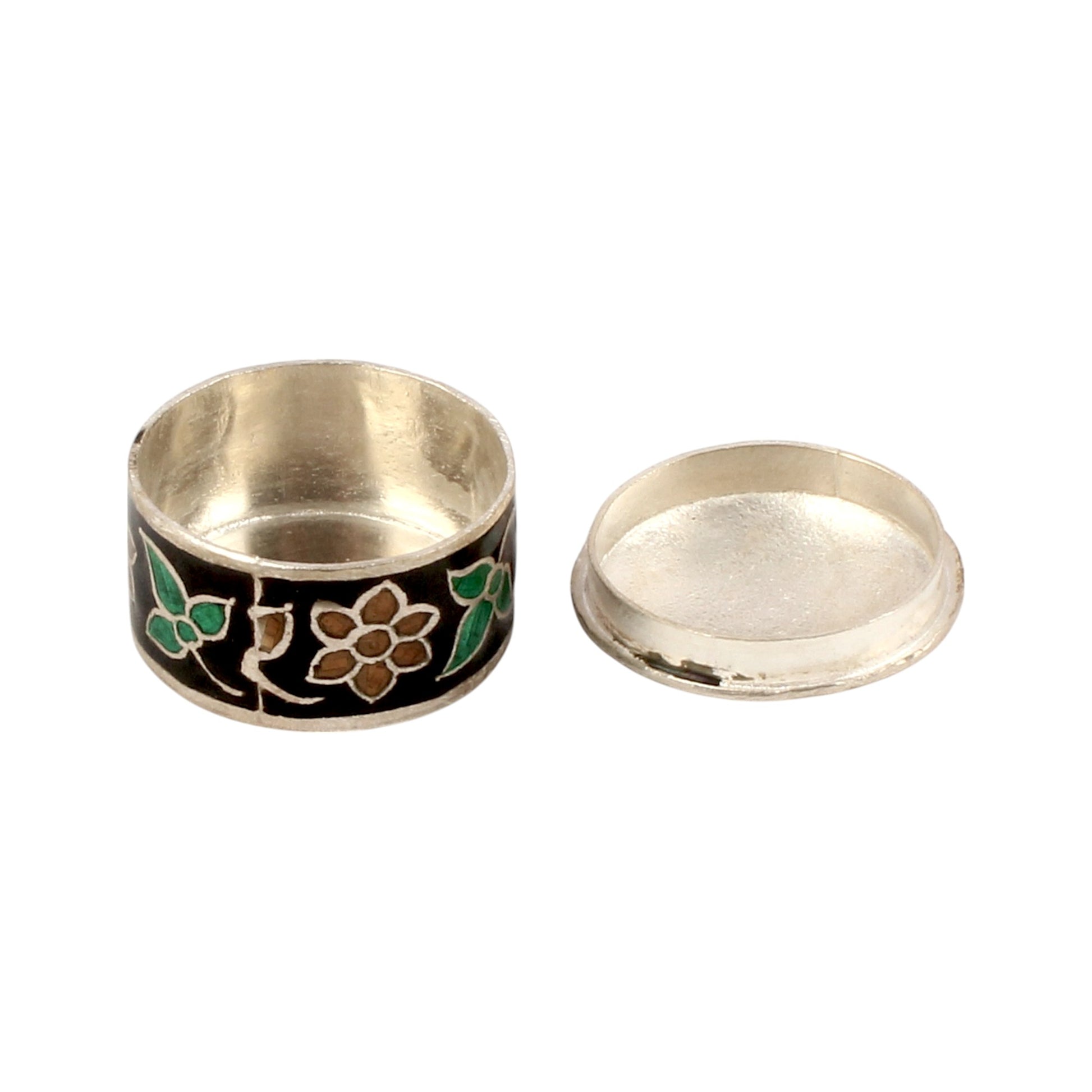 Crafted from high-quality 925 sterling silver, this Floral Leaf Enamel Work Box combines durability with elegant design. Measuring 2.10 inches and weighing 11.3 grams, it offers a compact yet sturdy storage solution for your enamelled jewelry. The intricate floral leaf enamel detailing enhances its aesthetic appeal, making it a refined choice for protecting and showcasing your treasured pieces.