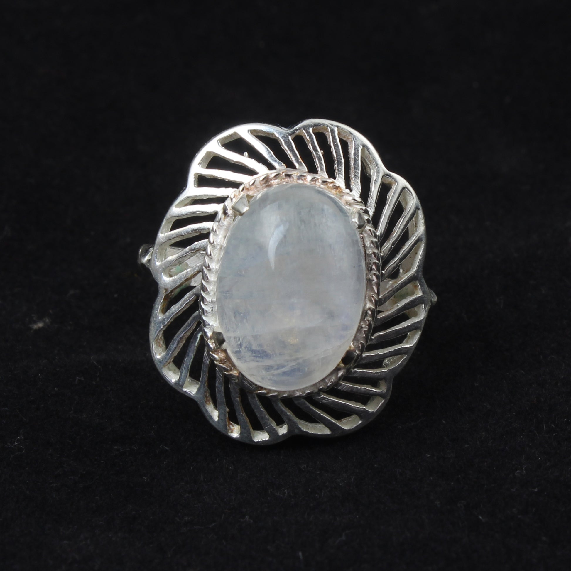 Crafted from 925 sterling silver, this floral oval ring showcases a natural rainbow moonstone measuring 14x10mm. The prong setting securely highlights the stone’s iridescent hues, weighing a total of 6.37 grams. Its elegant design combines expert craftsmanship with the gemstone’s unique shimmer, making it a sophisticated accessory for any occasion.