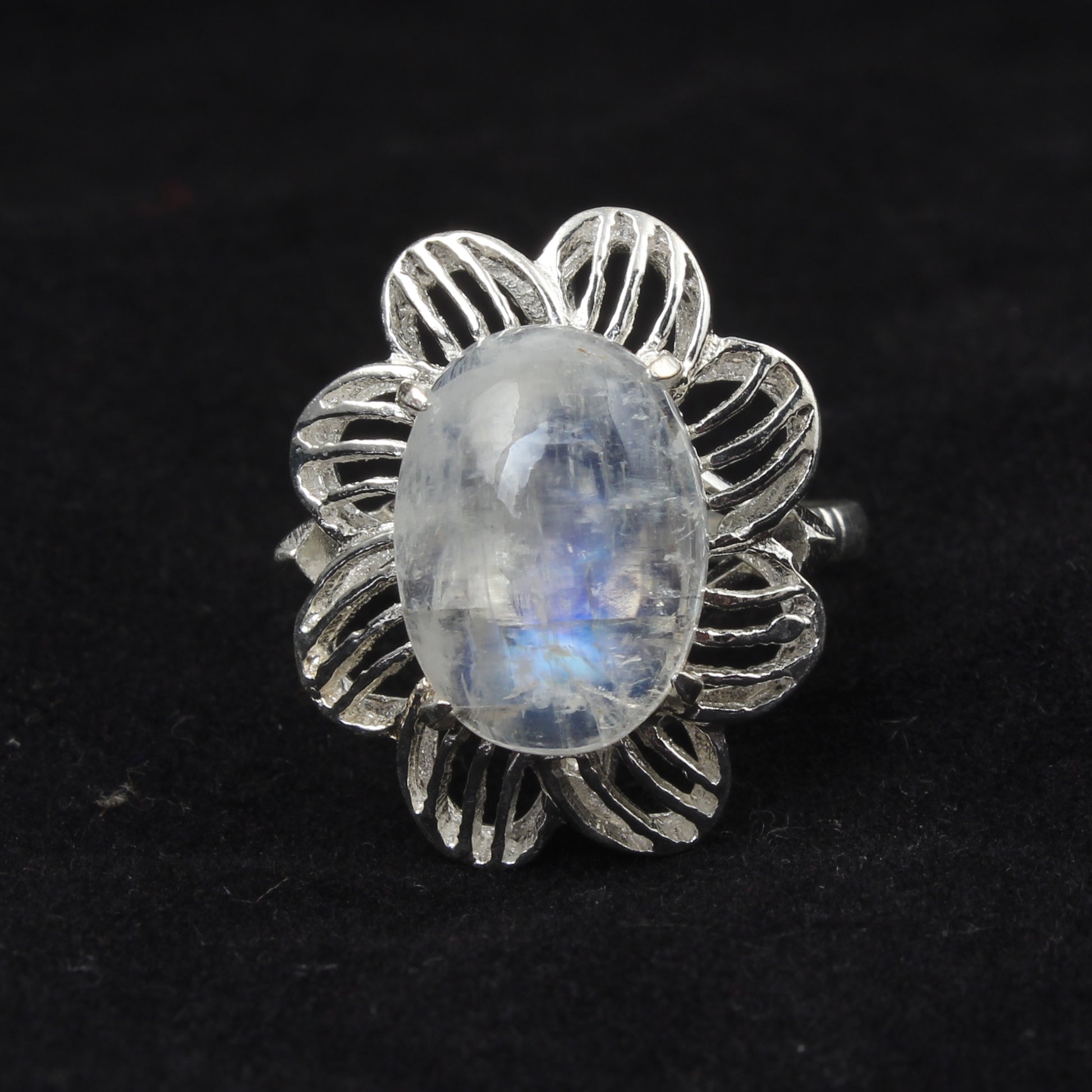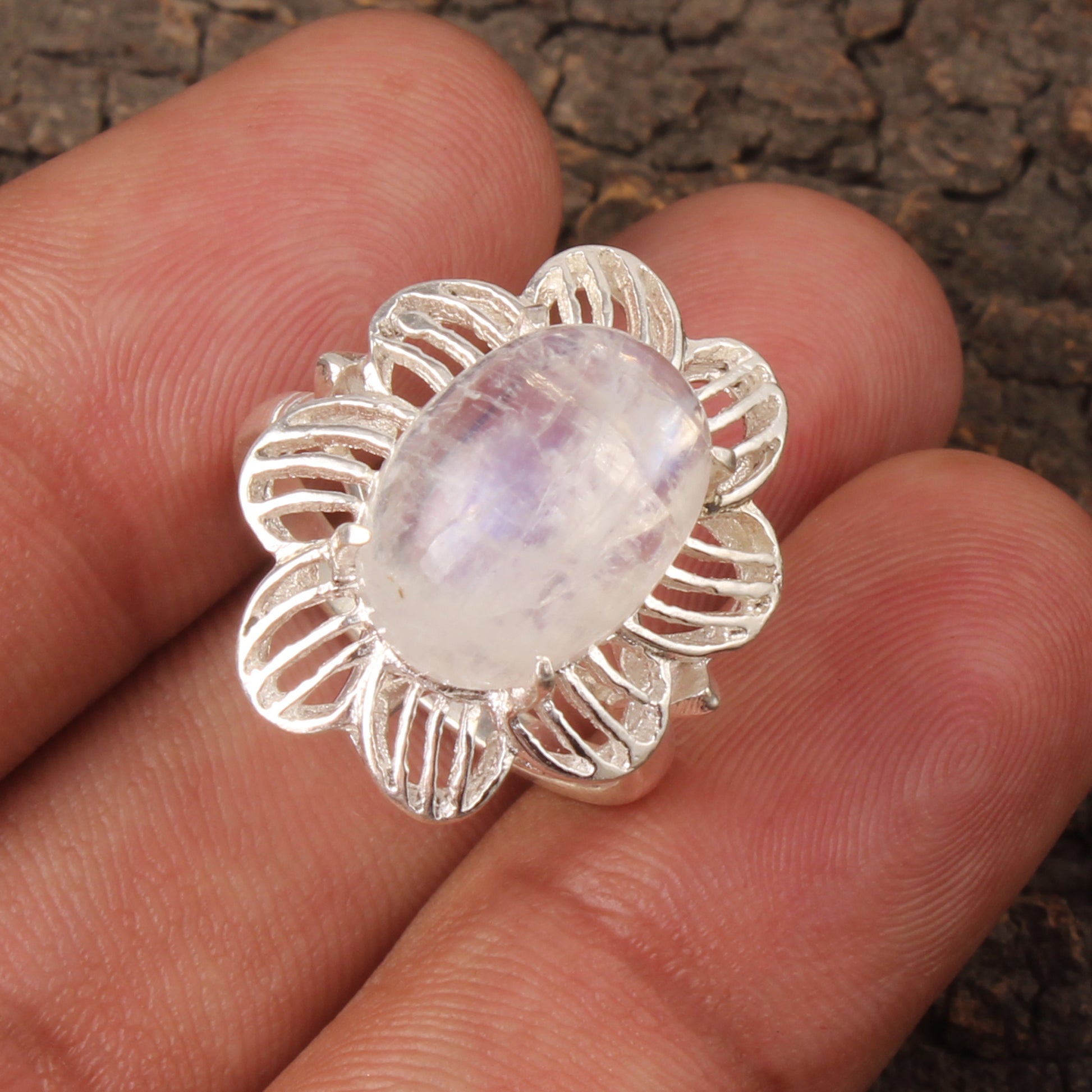 Crafted from 925 sterling silver, this designer ring features a 14x10mm natural rainbow moonstone set securely with a prong setting. Weighing 5.55 grams, its floral-inspired design highlights the gemstone’s shimmering, multi-hued flashes, making it a sophisticated addition to any collection. This piece combines expert craftsmanship with the unique beauty of genuine moonstone for lasting elegance.