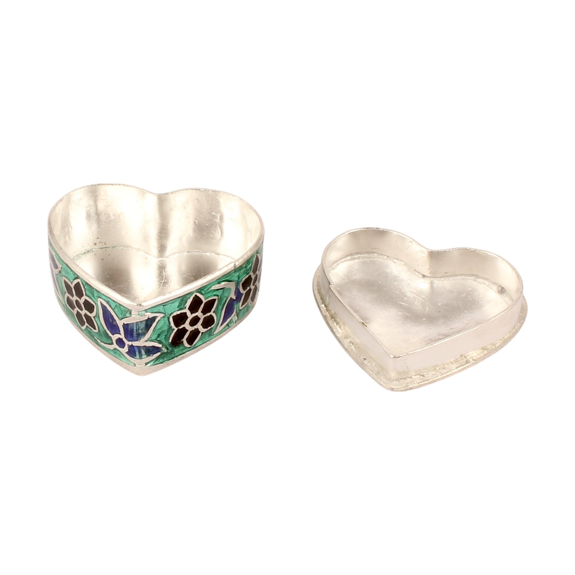 Crafted from 925 sterling silver, this heart-shaped meenakari floral trinket box combines traditional artistry with practical design. Measuring 1.2 by 1 inch and weighing 12 grams, it serves as a unique container ideal for storing sindoor or small valuables. Its intricate handmade detailing reflects expert craftsmanship, making it both a functional and decorative piece.