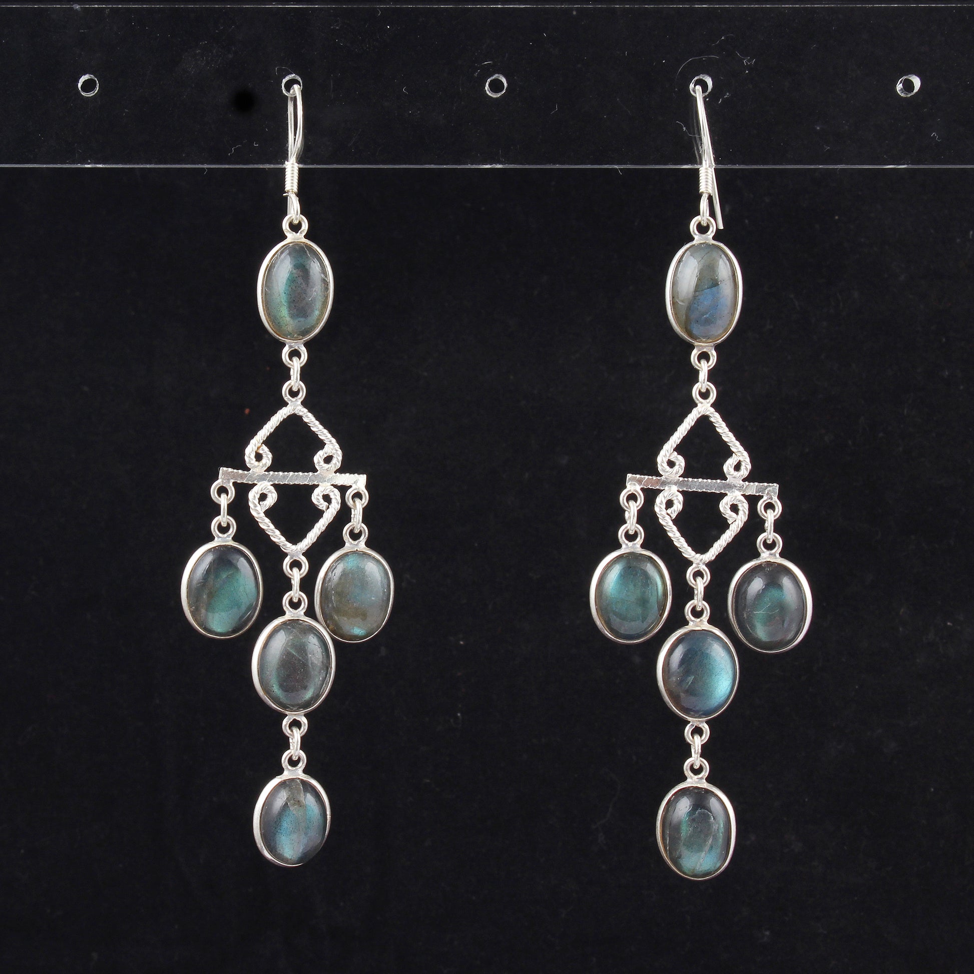 These handmade Labradorite chandelier earrings showcase natural oval gemstones measuring 11x9mm and 10x8mm, set in high-quality 925 sterling silver. With a size of 9.5 x 2.5 cm and a weight of 12.28 grams, they offer durable elegance and a distinctive dangle style. The Labradorite stones provide a unique play of colors, making each pair a refined statement piece suitable for sophisticated jewelry collections.