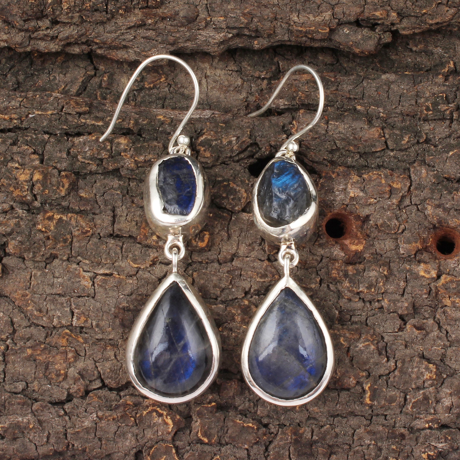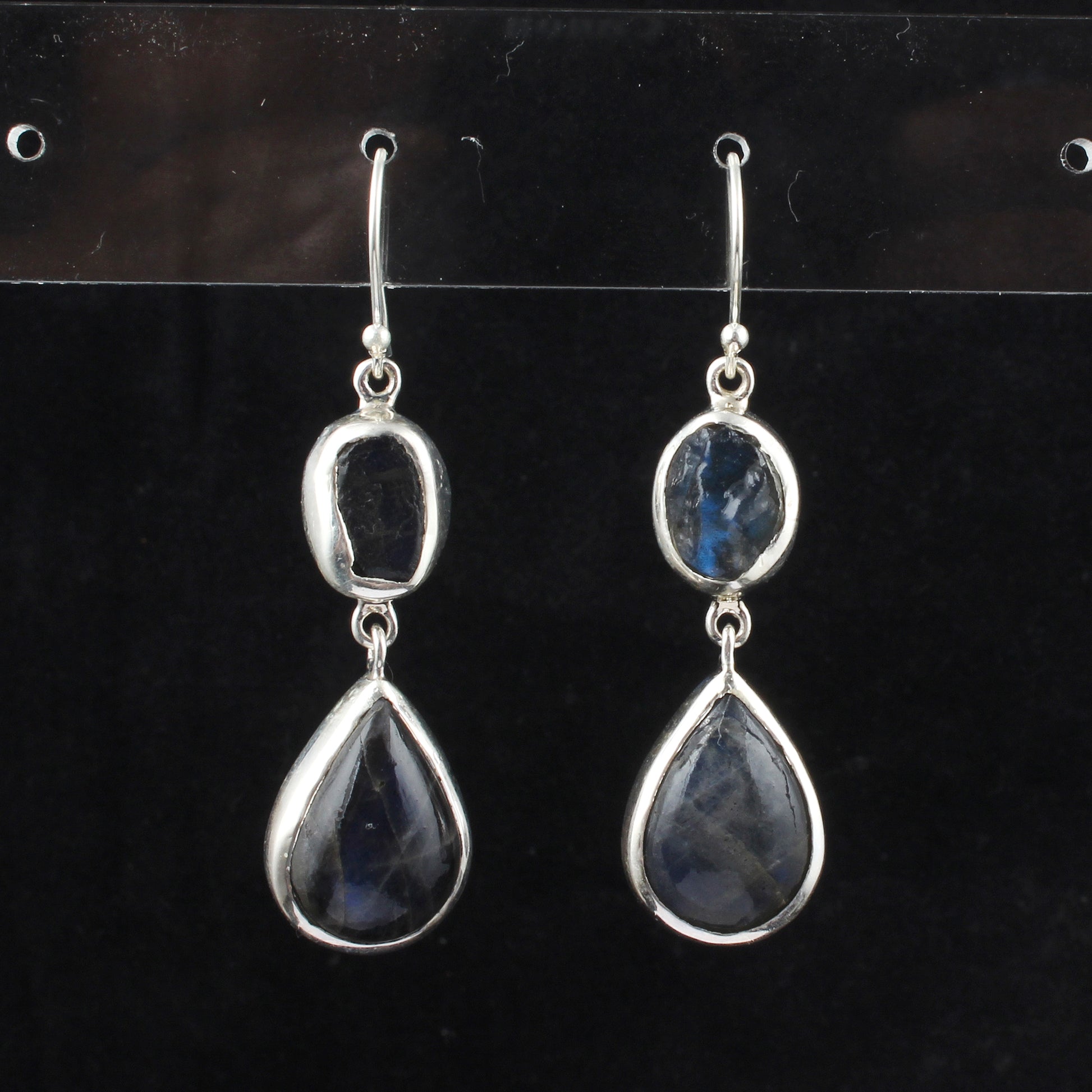 Crafted with genuine labradorite gemstones, these handmade dangle earrings feature stones sized 16x12mm and 11x9mm, set in 925 sterling silver. Measuring 5.7 x 1.3 cm and weighing 14.45 grams, they combine elegance with natural healing properties. Ideal for those seeking both style and the subtle energy benefits of labradorite.