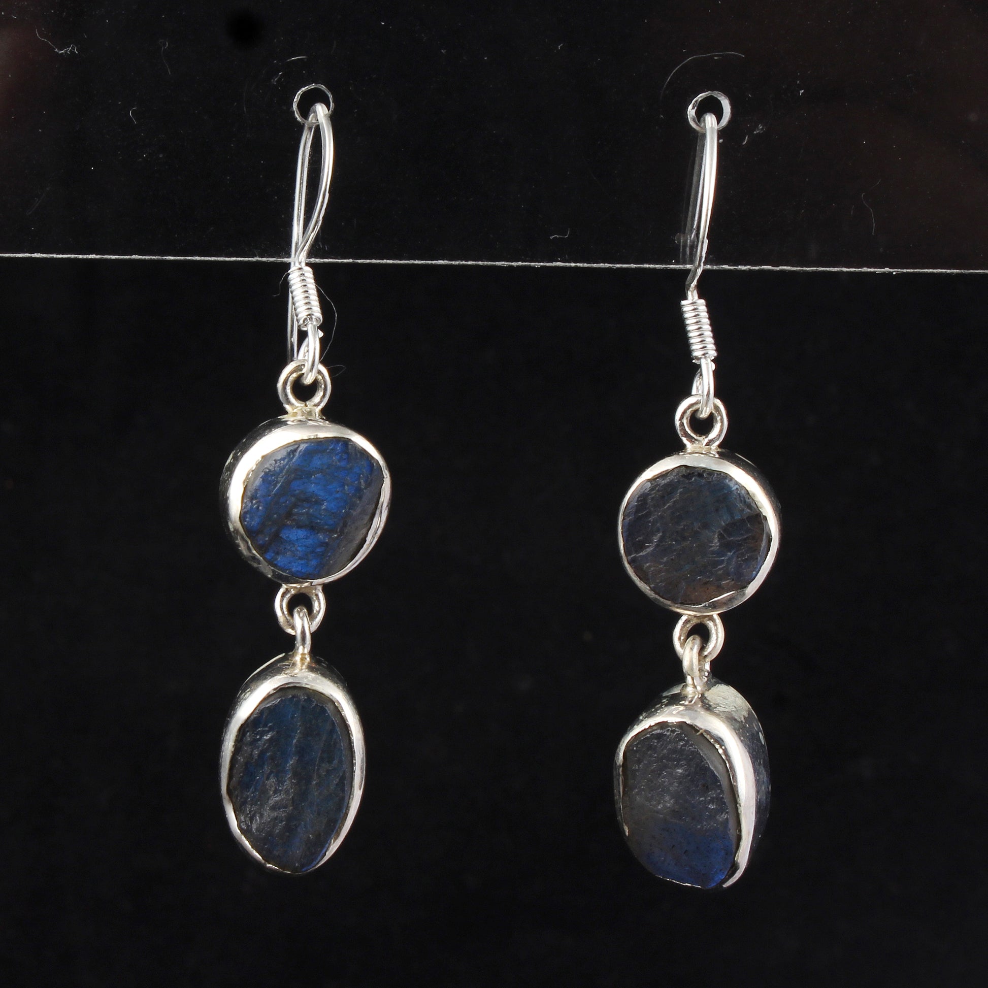 These handmade Labradorite earrings feature natural rough crystals set in 925 sterling silver. Measuring 4.7 by 1.1 cm, with stone sizes of 13x9mm and 10mm, they offer a unique dangle design weighing 8.92 grams. The iridescent labradorite stones provide subtle flashes of color, making these earrings a refined choice for those seeking both natural beauty and artisan craftsmanship.