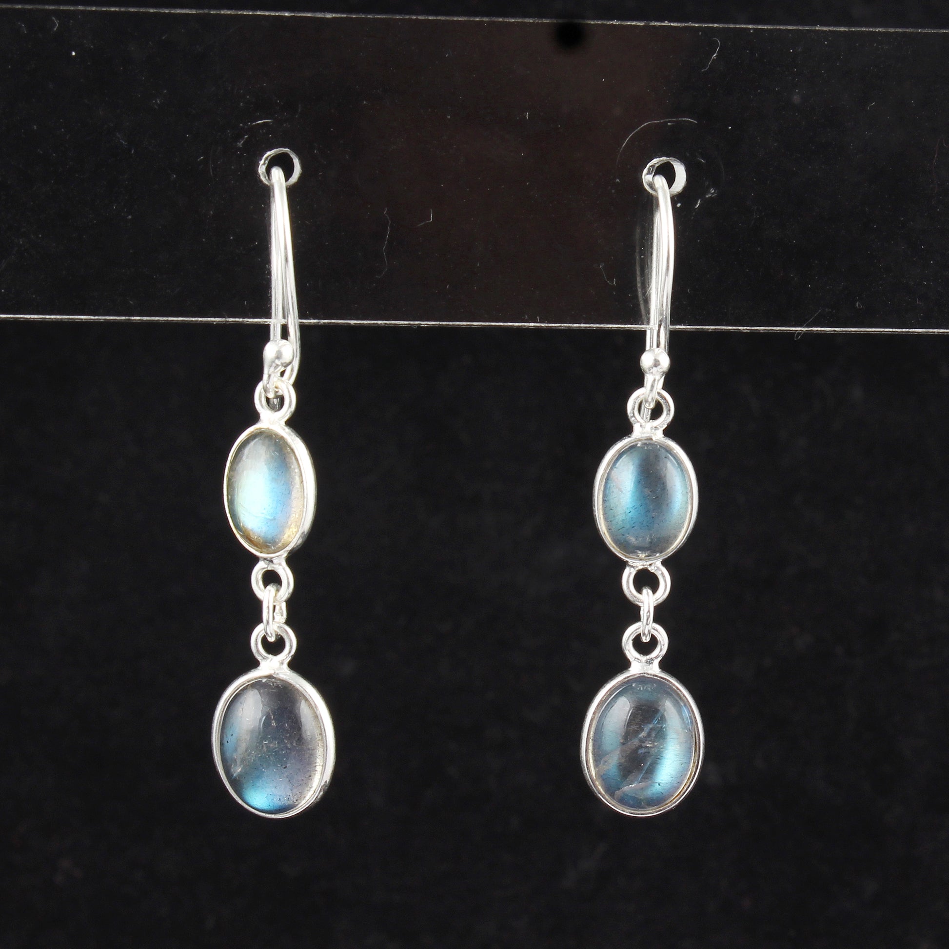 These Labradorite earrings showcase oval gemstones measuring 8x6mm and 7x5mm, set in a 925 sterling silver bezel for durability and elegance. At a lightweight 2.41 grams and dimensions of 3.7 x 0.8 cm, they offer comfortable wear while highlighting the distinctive shimmer of labradorite. Perfect for those seeking sophisticated, expert-crafted jewelry that combines subtle color play with a refined drop design.