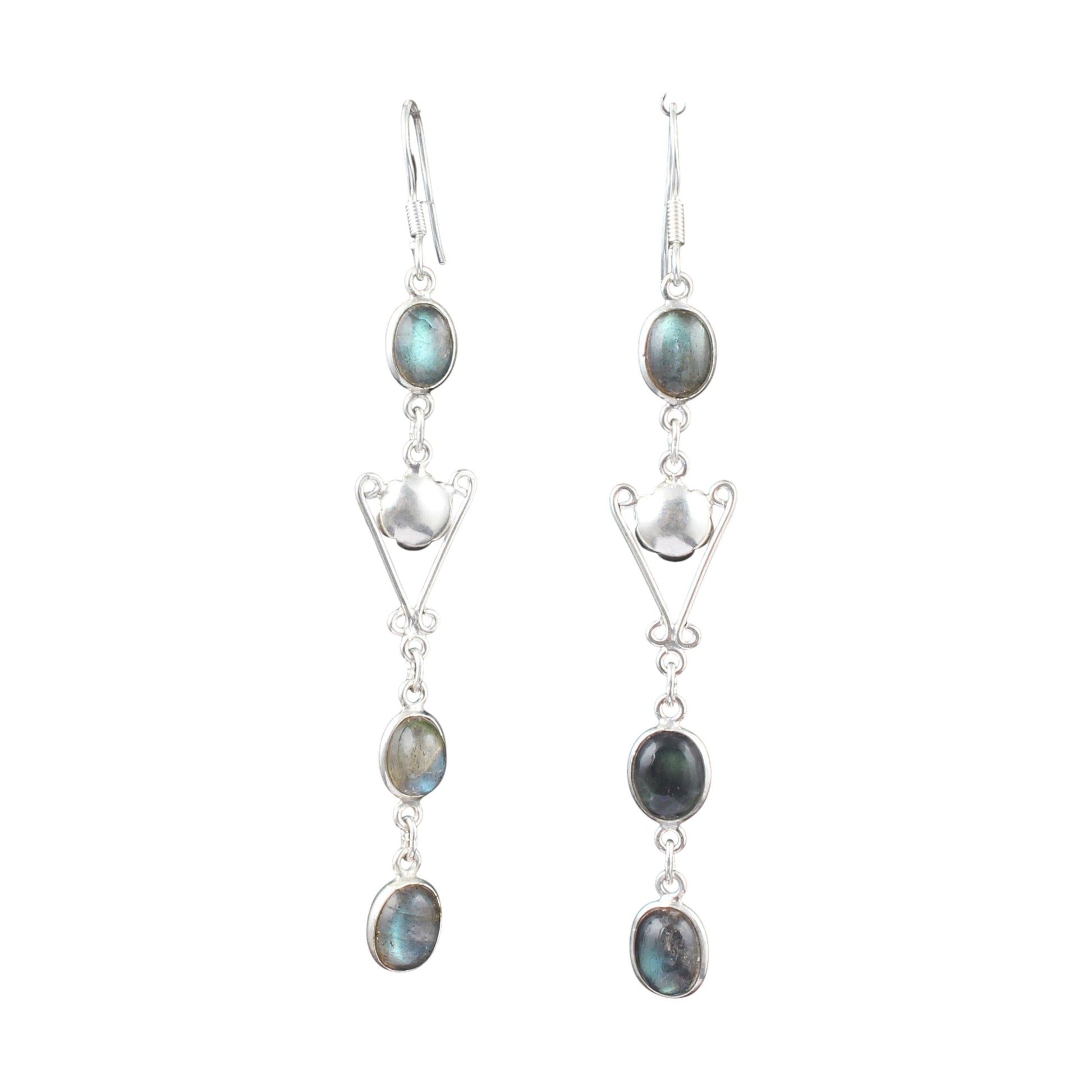 These handmade dangle earrings feature natural labradorite gemstones set in 925 sterling silver. Each earring measures 8.5 x 1.2 cm and showcases oval stones of 9x7 mm, 8x6 mm, and 7x5 mm sizes, offering a unique layered look. Weighing 5.02 grams, they combine artisanal craftsmanship and authentic materials for a sophisticated accessory that highlights labradorite's distinctive iridescence with durable and elegant silver settings.