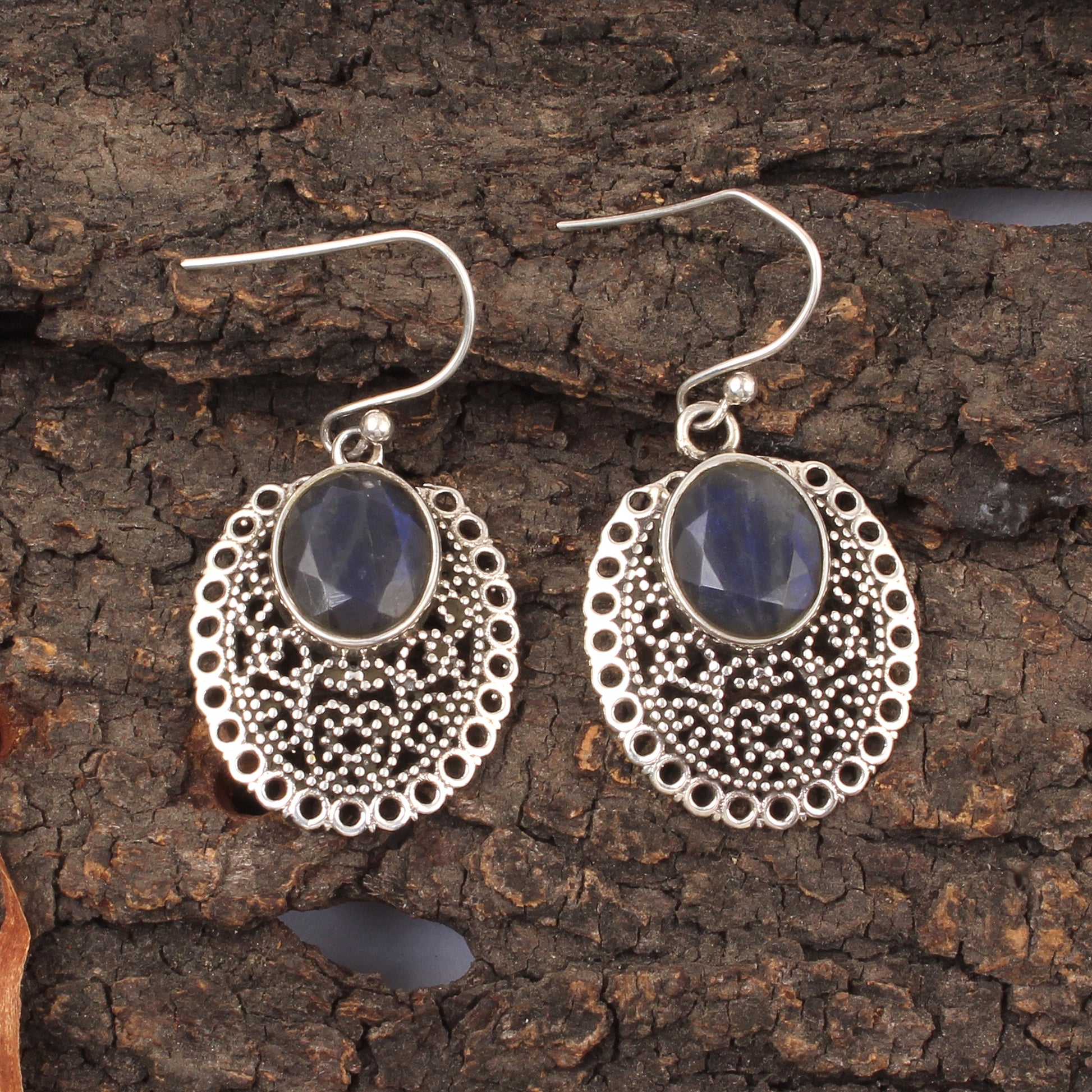 These handcrafted Labradorite earrings feature oval faceted gemstones measuring 11x9 mm, set in vintage-style 925 sterling silver. With a size of 4 x 2 cm and a weight of 6.66 grams, they offer a striking balance of elegance and durability. The natural shimmer of Labradorite enhances any outfit, making these earrings an exceptional gift for those who appreciate artisanal jewelry.