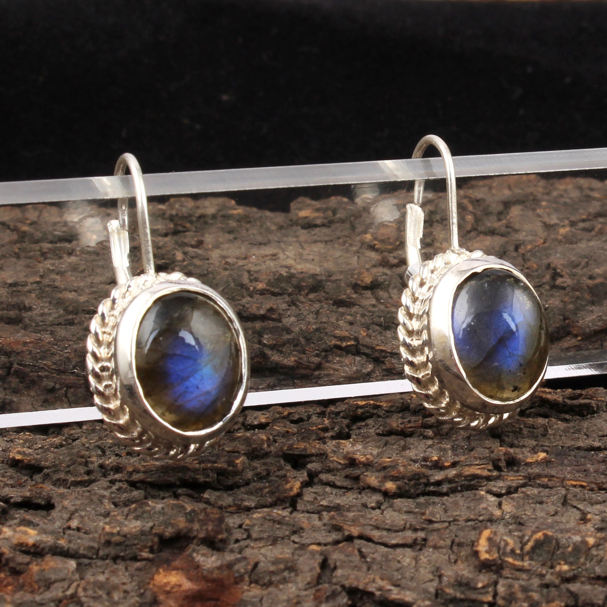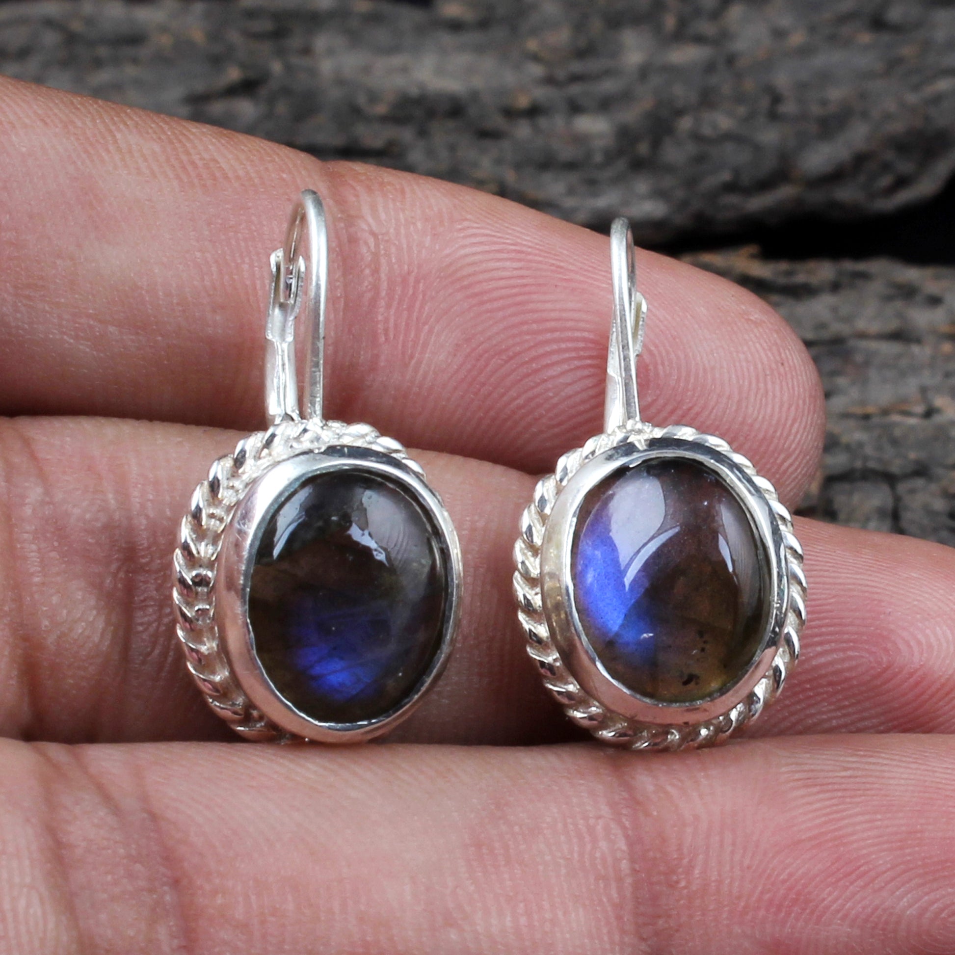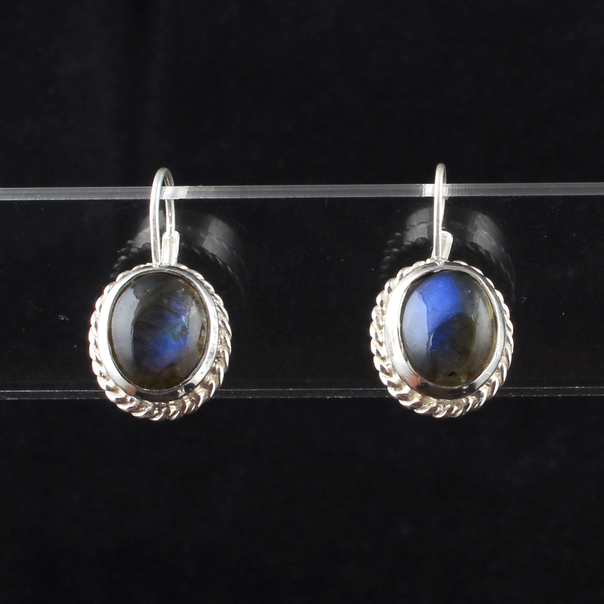 Crafted from 925 sterling silver, these Labradorite earrings feature elegant twisted wire details that enhance their sophisticated design. Each earring holds a 10x8mm oval Labradorite gemstone, known for its captivating play of colors, set securely in a lever-back dangle style measuring 2.6 x 1.2 cm. Weighing 5.48 grams, they offer a balanced combination of durability and comfort, making them an exquisite choice for adding subtle yet striking allure to your collection.
