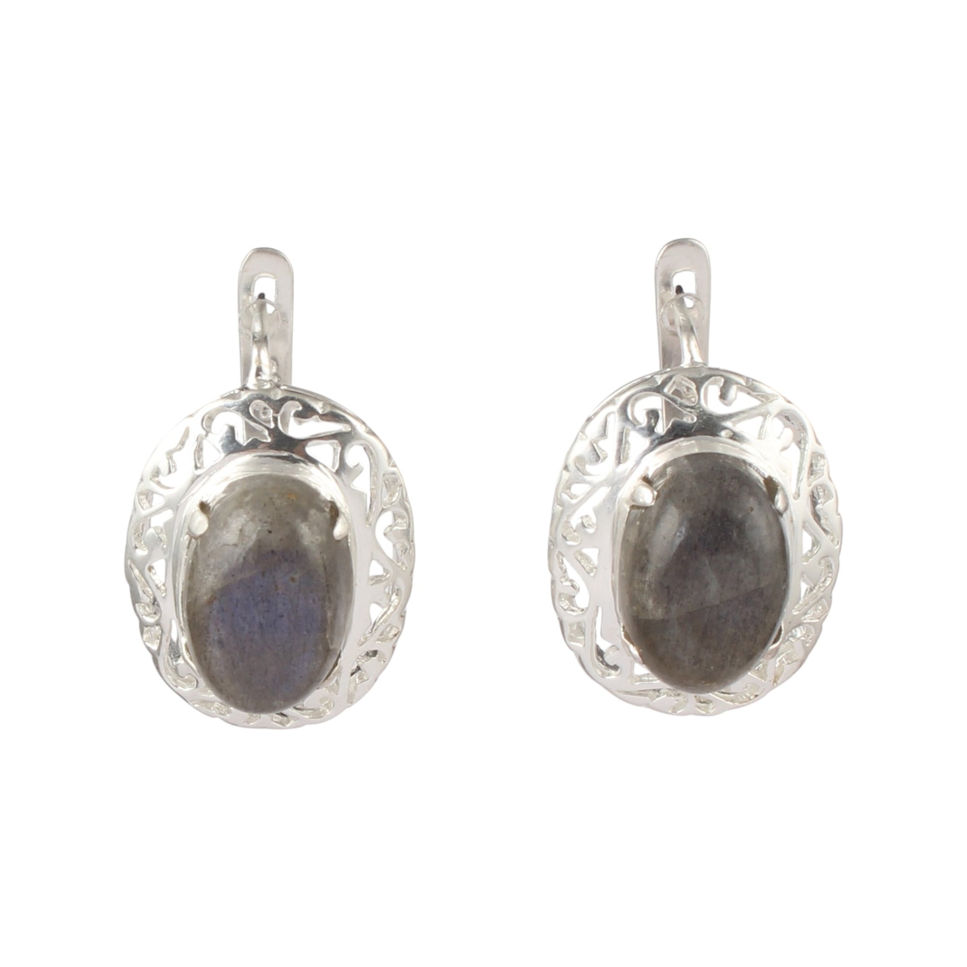 These handcrafted Labradorite earrings feature 14x10mm oval gemstones securely set in an openwork prong setting, highlighting the stone’s unique iridescence. Crafted from 925 sterling silver with a Russian lock mechanism, they offer both durability and secure wear. Measuring 2.2 x 1.8 cm and weighing 9.11 grams, these earrings combine expert craftsmanship with elegant design, making them a refined addition to any collection.