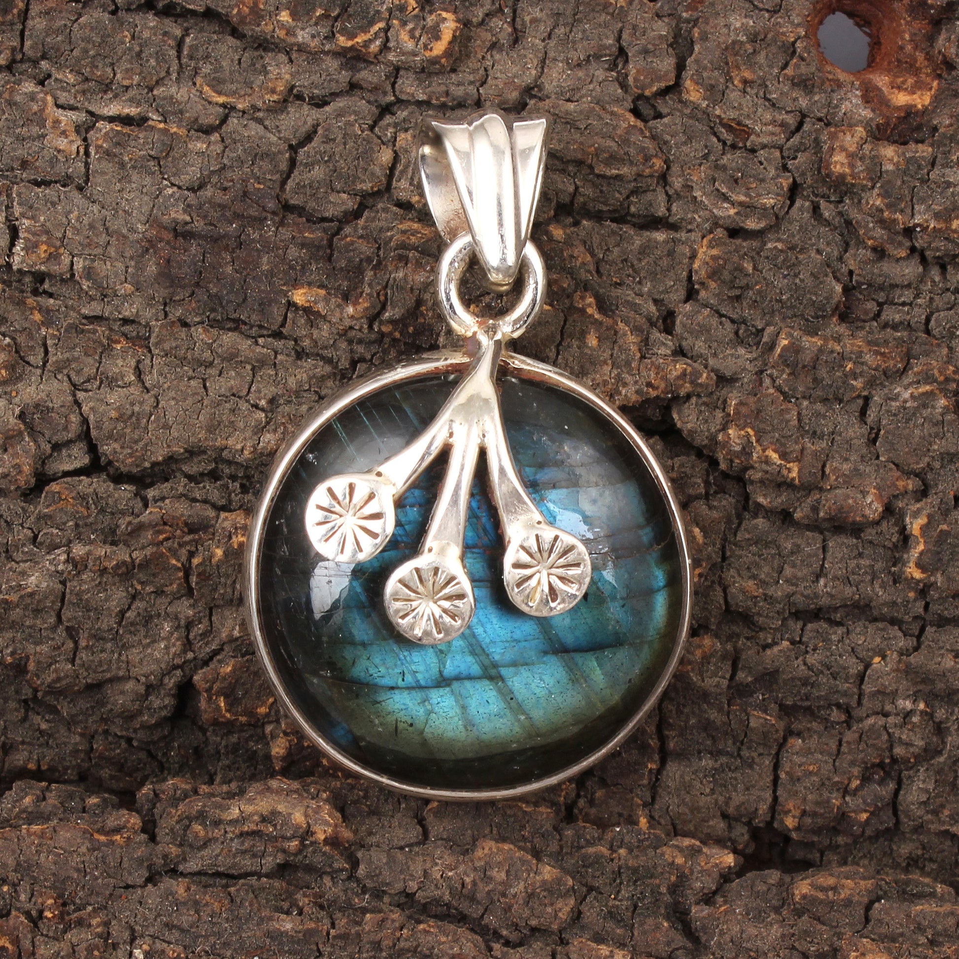 This exquisite pendant features a round labradorite gemstone measuring 35x22mm, set in 925 sterling silver with an intricate floral motif. Weighing 9.69 grams, it combines artisanal craftsmanship with the unique iridescence of labradorite, making it a sophisticated accessory for any jewelry collection. Ideal as a thoughtful gift, it offers both elegance and the reputed protective qualities associated with this stone.