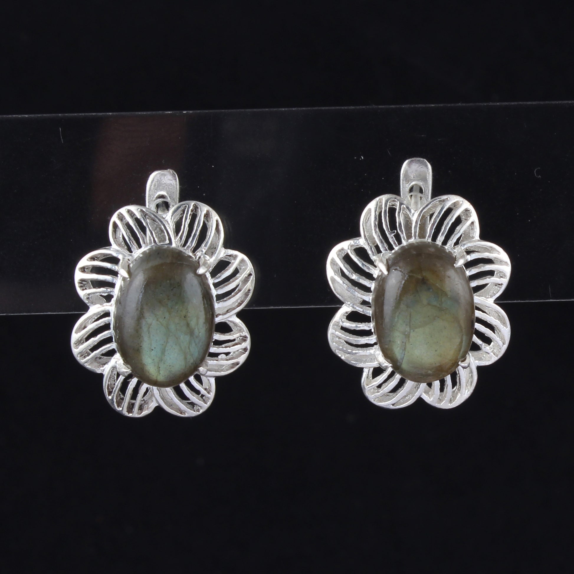 These handcrafted Labradorite earrings feature a 14x10mm oval gemstone securely set in a prong setting, highlighting its natural iridescence. Measuring 2.2 x 1.7 cm and weighing 8.63 grams, they are crafted from 925 sterling silver with an openwork design for a delicate yet durable structure. The Russian lock ensures a reliable closure, combining elegance with secure wear for everyday sophistication.