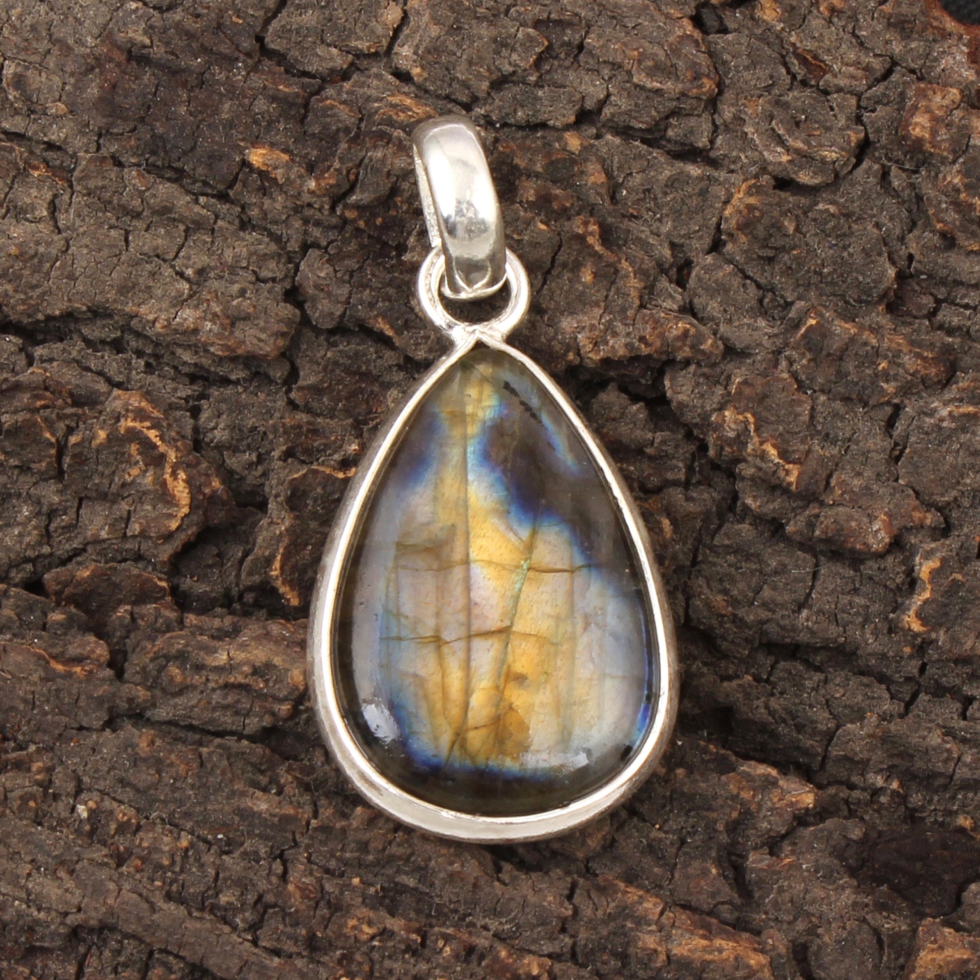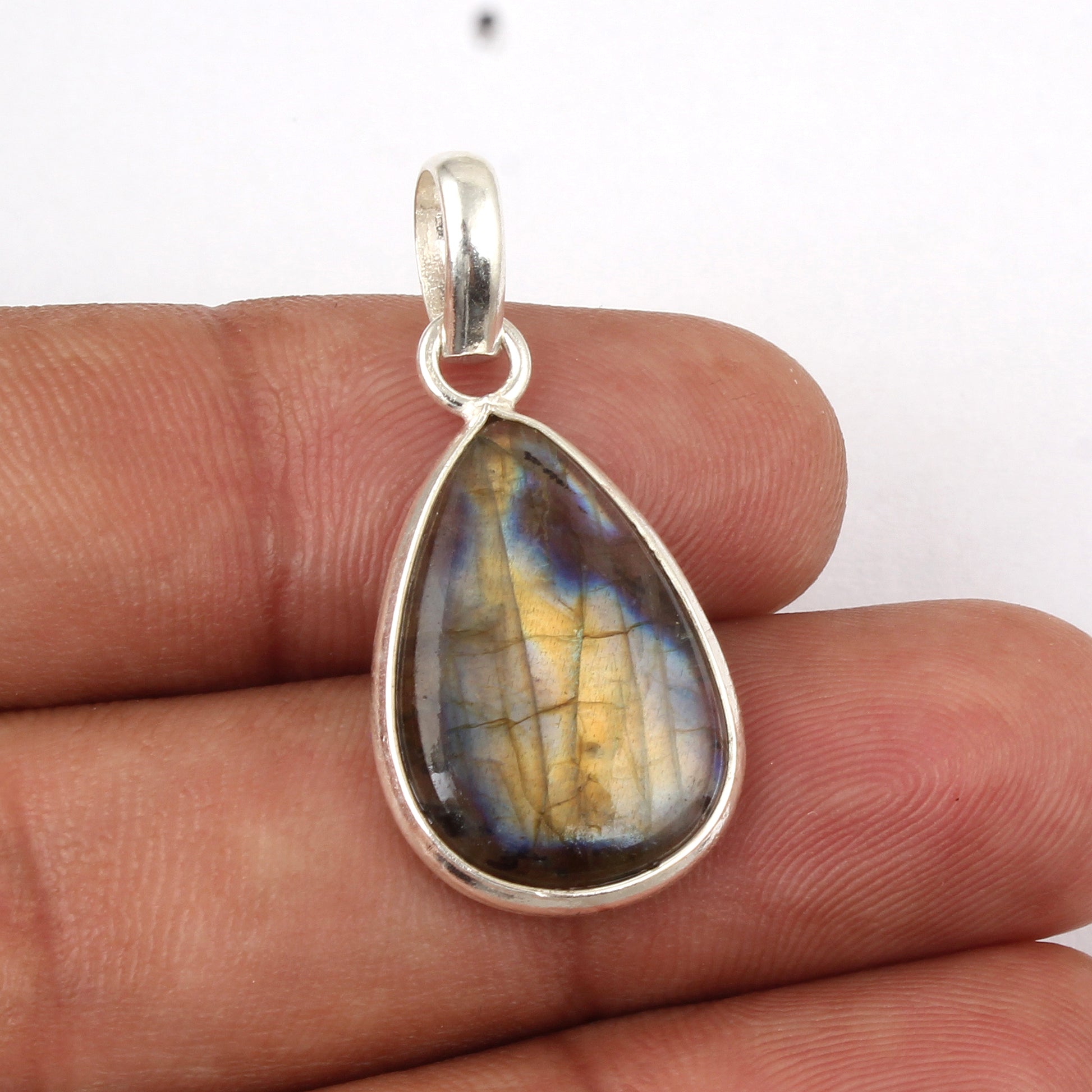 Crafted with precision, this Labradorite pendant features a pear-shaped gemstone measuring 32x15mm, elegantly set in a 925 sterling silver bezel. Weighing just 2.85 grams, the handmade design highlights the stone’s natural iridescence, making it a refined accessory that balances durability with artisanal detail. Ideal for those who appreciate expert craftsmanship and the unique beauty of labradorite.