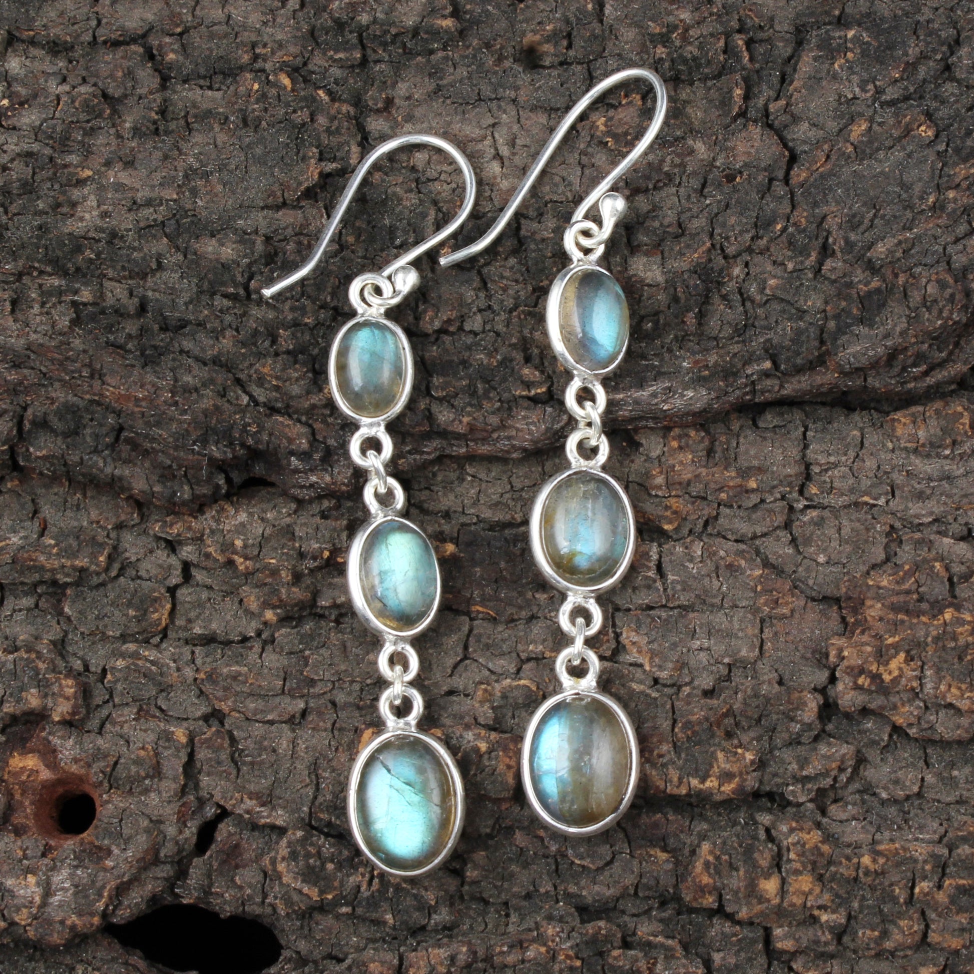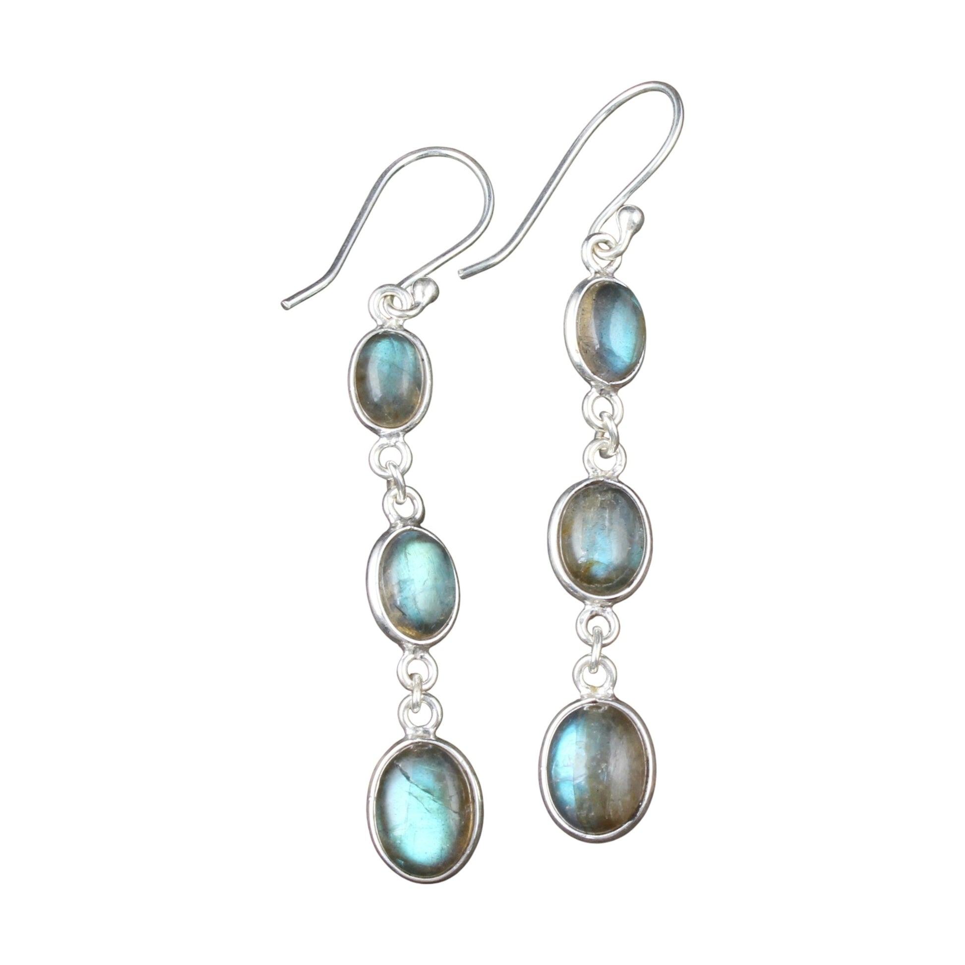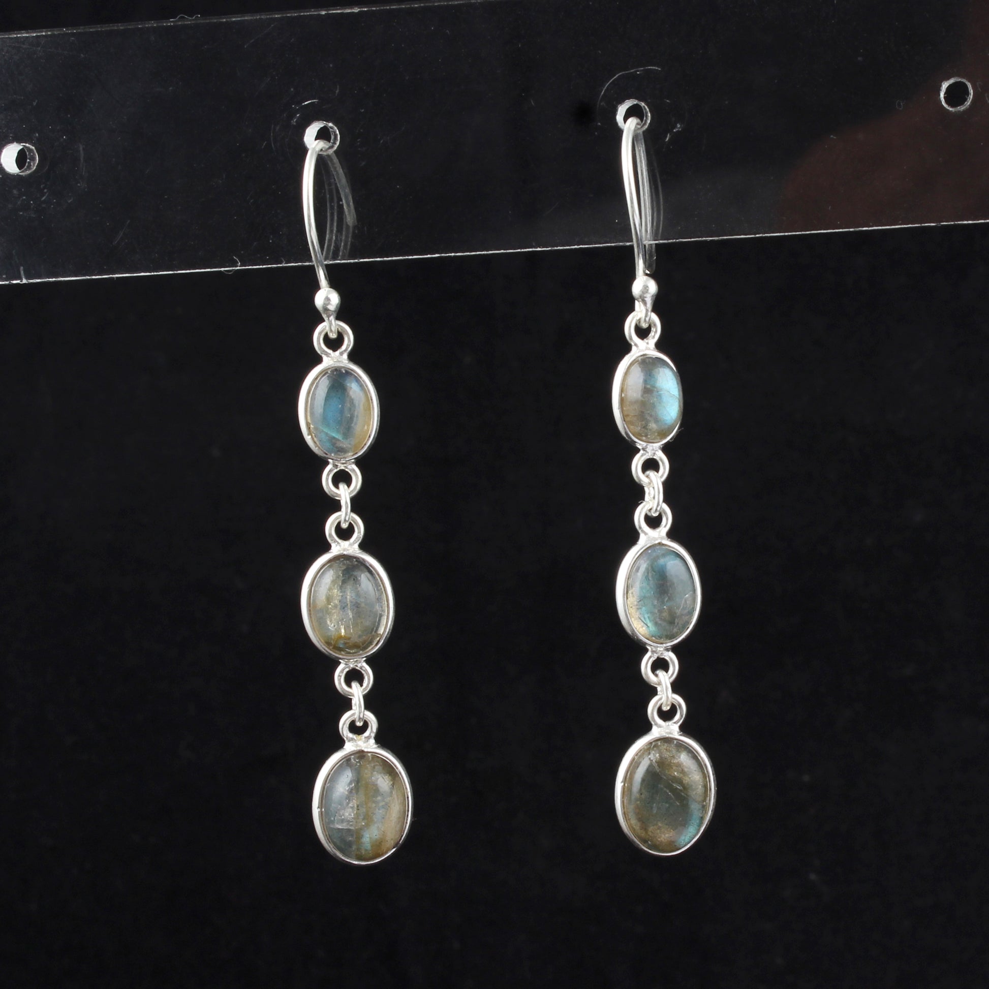 Crafted with precision, these long dangle earrings showcase natural labradorite gemstones set in a handmade bezel of 925 sterling silver. Featuring oval stones measuring 9x7mm, 8x6mm, and 7x5mm, the design balances elegance with a subtle play of color unique to labradorite. Measuring 5.5 x 0.8 cm and weighing 3.56 grams, these earrings offer lightweight comfort alongside expert craftsmanship, making them a refined addition to any jewelry collection.