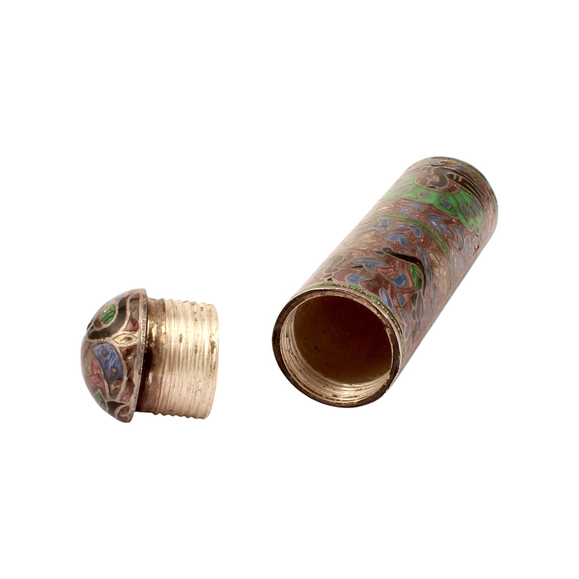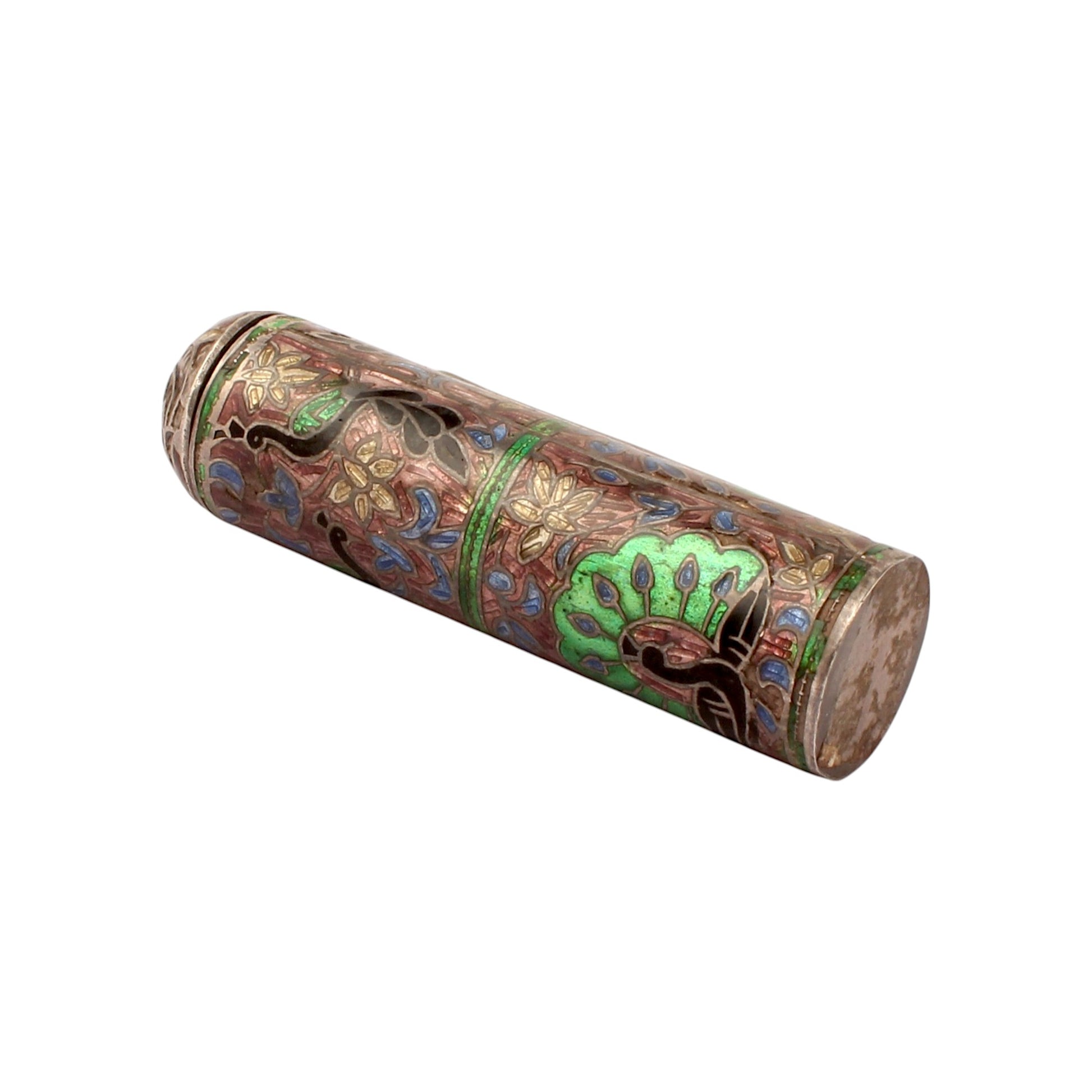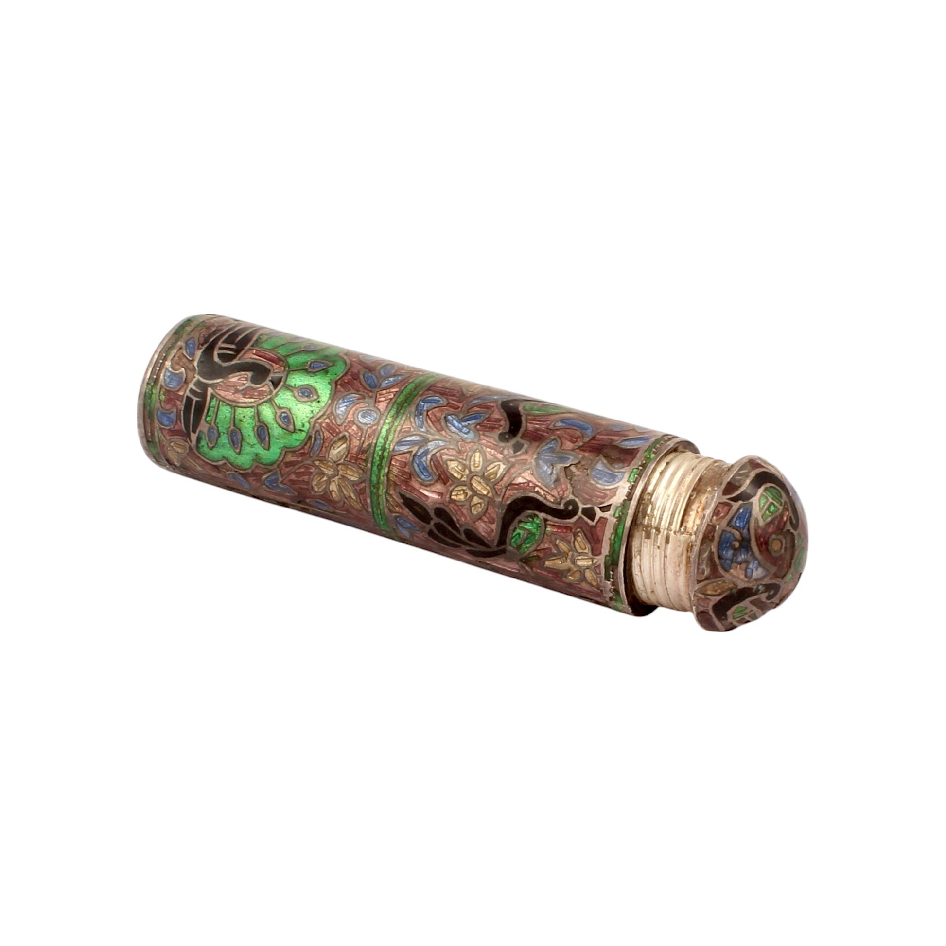 Crafted from 925 sterling silver, this Meenakari bottle-shaped trinket box combines traditional artistry with functional design. Measuring 2.3 inches by 0.75 inches and weighing 18.72 grams, it offers a compact yet sturdy container ideal for storing small valuables. The intricate handmade Meenakari work enhances its uniqueness, making it a distinguished piece for collectors and connoisseurs of fine silverware.