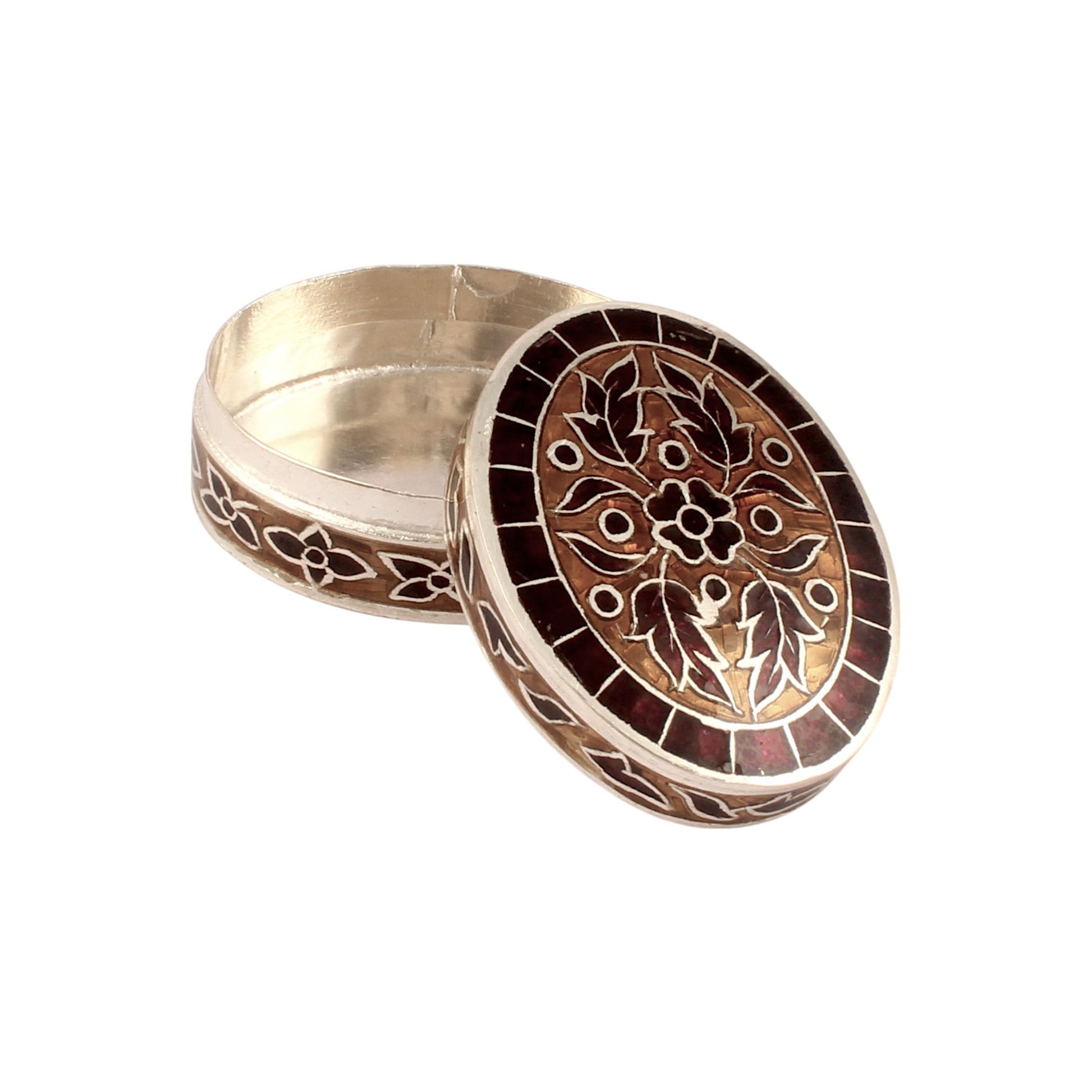 Crafted from authentic 925 sterling silver, this Meenakari work trinket box features an intricate floral design that highlights traditional artistry. Measuring 1.7 by 1.4 inches and weighing 25.88 grams, it serves as an elegant and durable container, ideal for storing sindoor or small valuables. Its handmade quality ensures each piece is unique, combining functionality with exquisite craftsmanship.
