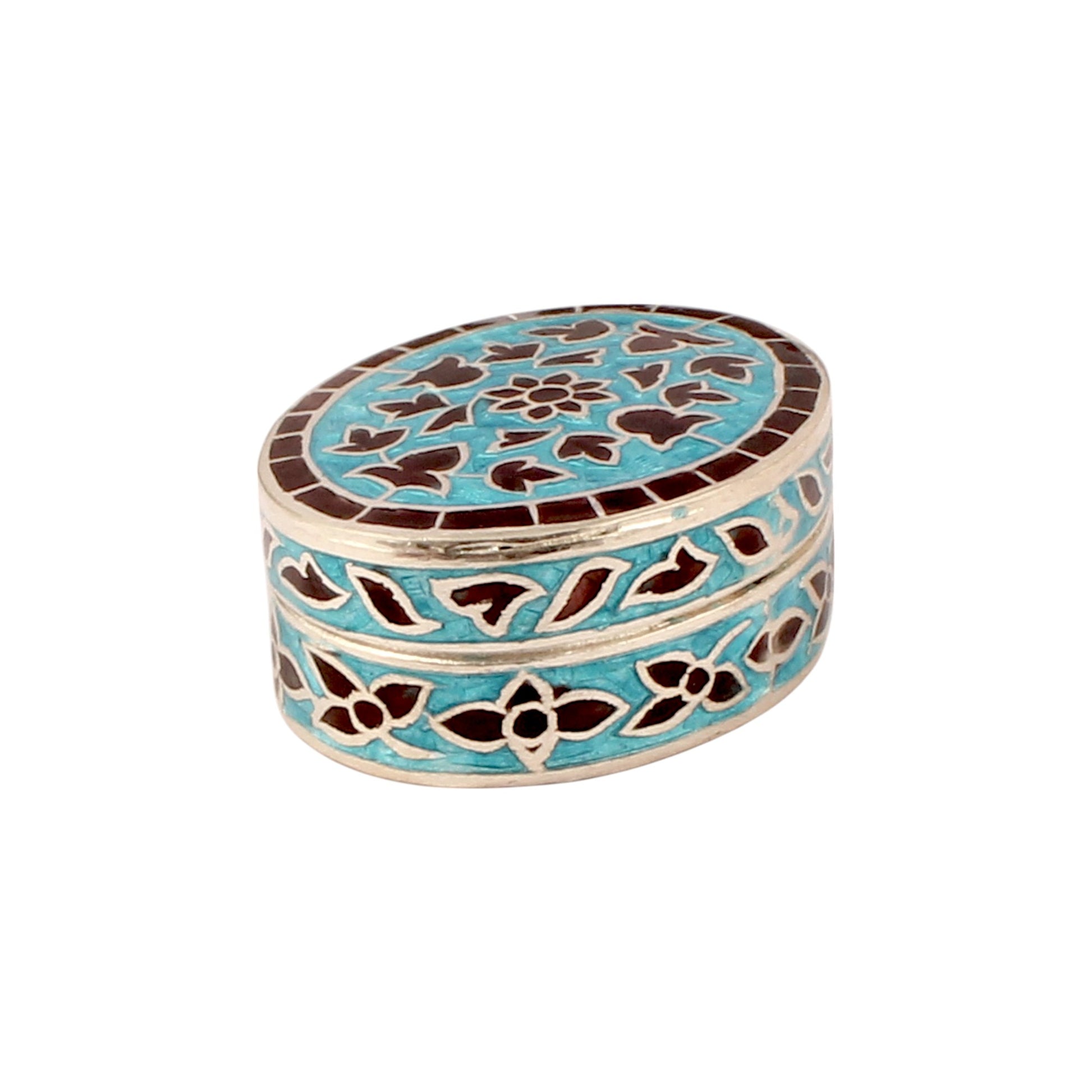 Crafted from 925 sterling silver, this handmade Meenakari work trinket box features an intricate floral design, blending traditional artistry with durable craftsmanship. Measuring 1.5 by 1.2 inches and weighing 18.09 grams, it serves as an elegant container for sindoor or small keepsakes, combining functionality with exquisite aesthetic appeal.