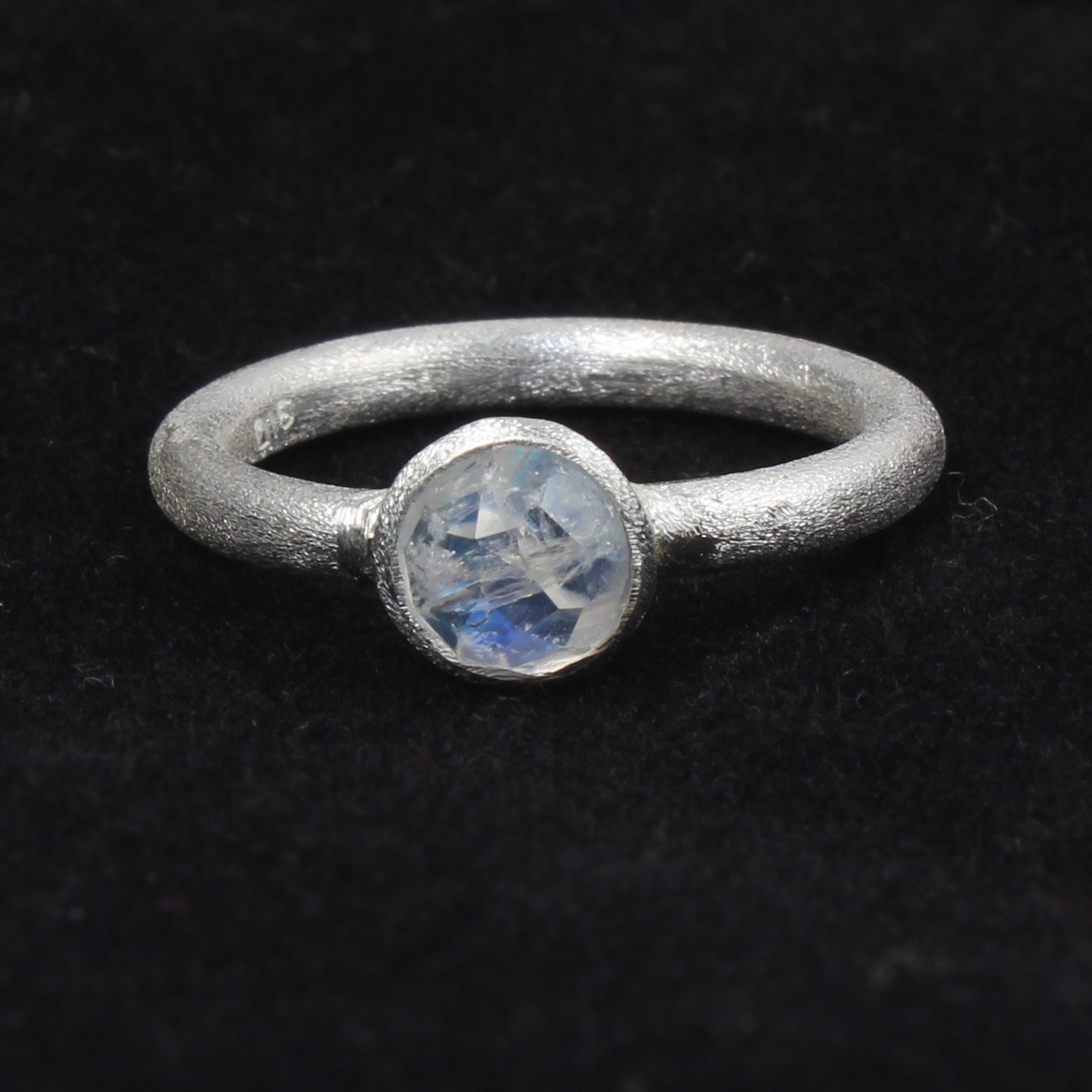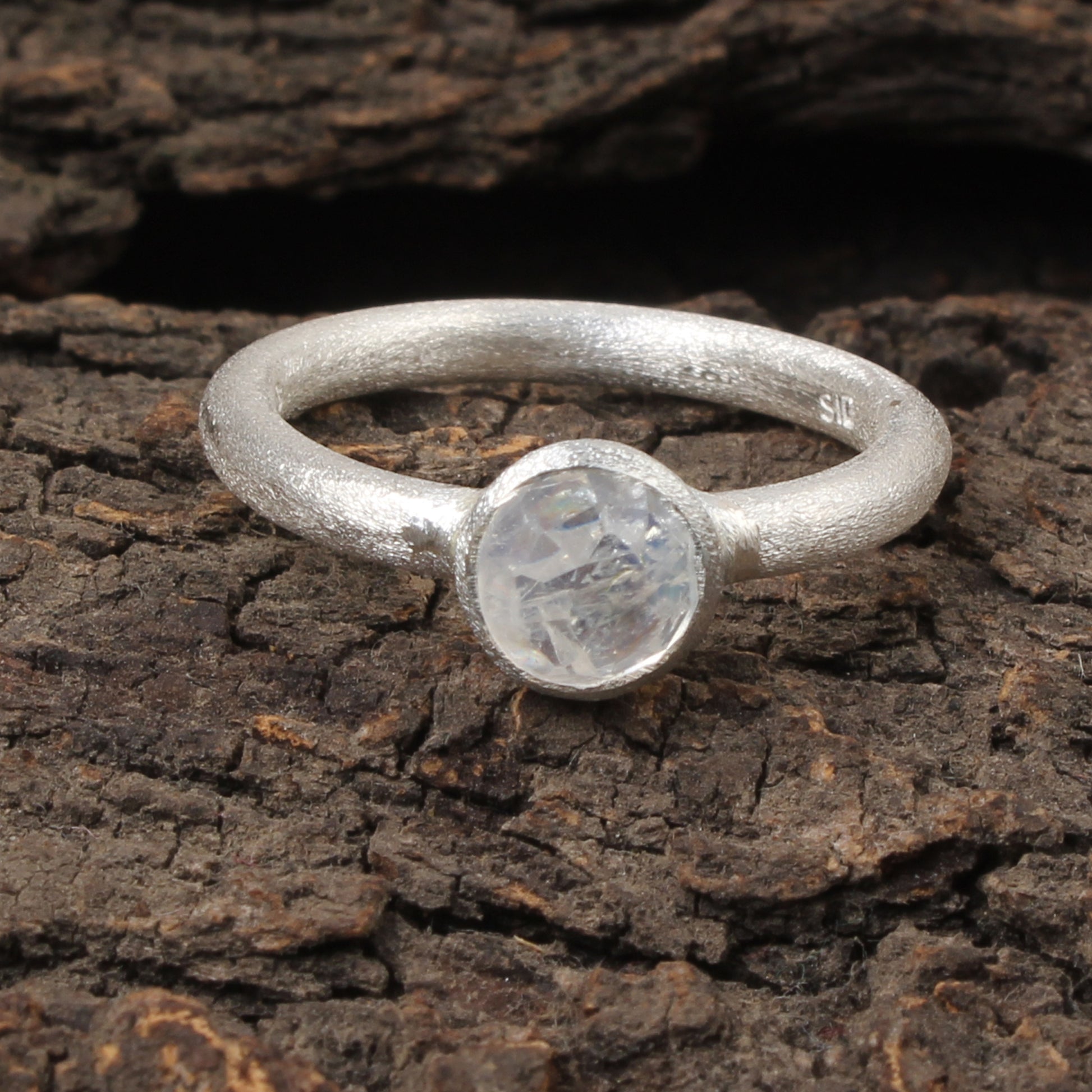Crafted from 925 sterling silver, this minimalist ring features a 5mm faceted natural Rainbow Moonstone that captures light with subtle iridescence. Weighing just 2.94 grams, its matte finish enhances the understated elegance, making it an ideal choice for those seeking refined, expert-crafted jewelry with a natural touch.