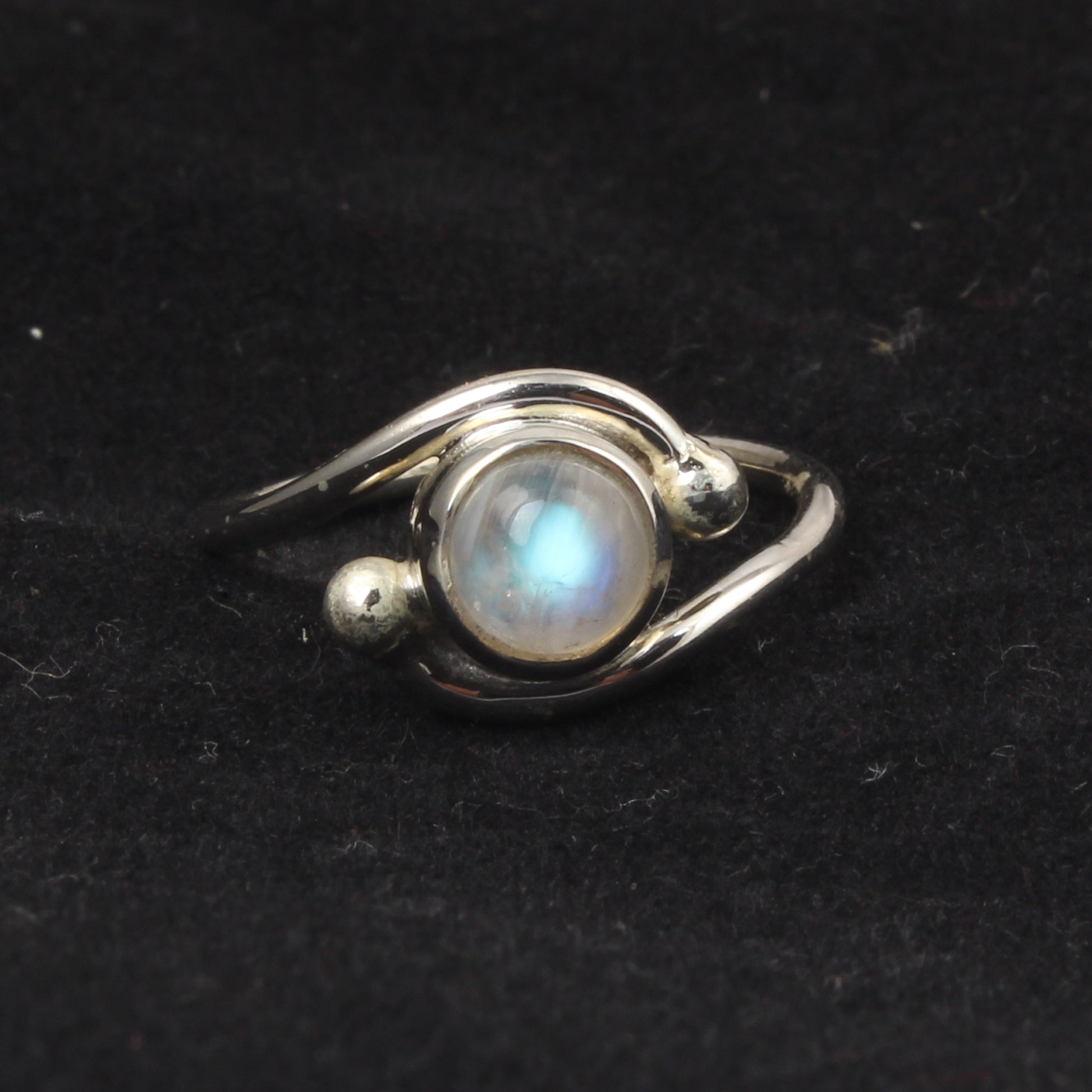 Crafted from 925 sterling silver, this minimalist bypass ring features a natural 6mm round rainbow moonstone, renowned for its ethereal glow. Weighing 2.59 grams, the handcrafted design offers both elegance and durability, making it a refined choice for those seeking subtle, expert-level jewelry that highlights the unique beauty of genuine gemstones.