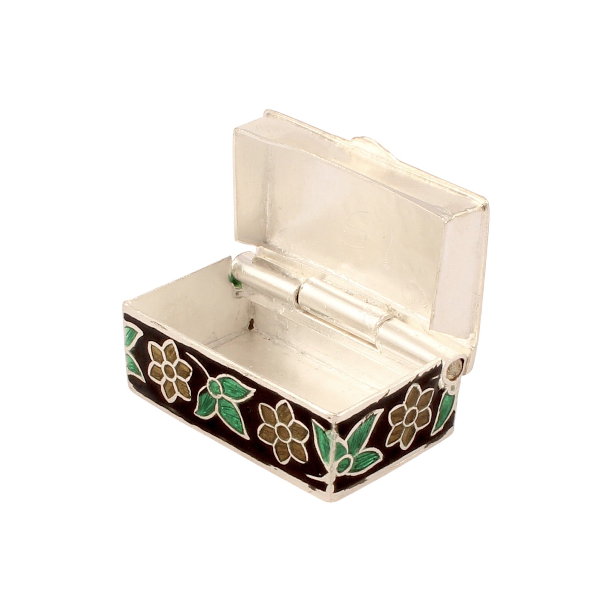 Crafted from 925 sterling silver, this multicolor floral leaf enamel work box measures 1.4 by 0.9 inches and weighs 22.25 grams. Its intricate enamel detailing highlights expert craftsmanship, making it a refined piece for storing small jewelry or keepsakes with elegance and durability.