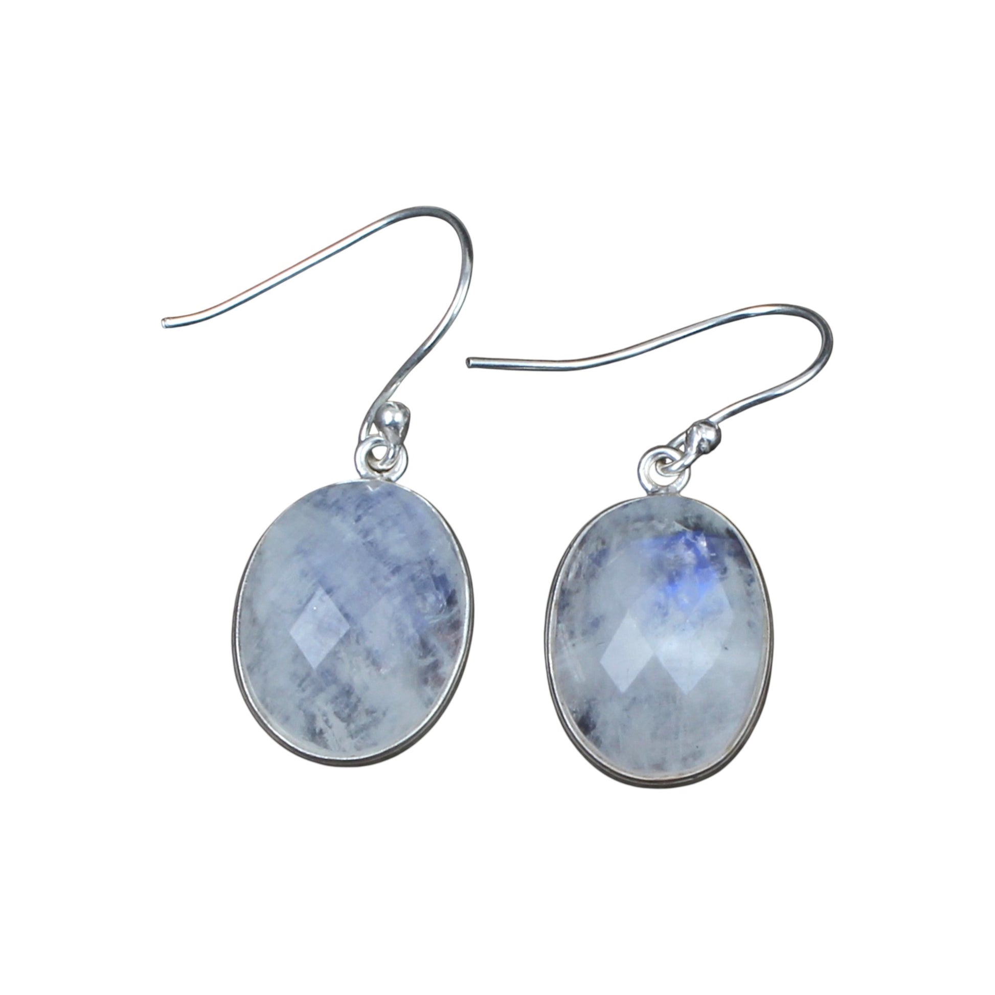 These handcrafted dangle earrings feature natural faceted rainbow moonstones set in 925 sterling silver. Each oval stone measures 16x12mm, showcasing a captivating play of white and subtle rainbow hues. With a total earring size of 3.2 x 1.4 cm and a lightweight 4.72 grams, they offer elegant sophistication suitable for both everyday wear and special occasions. The precise faceting enhances the stones' natural glow, reflecting expert craftsmanship and attention to detail.
