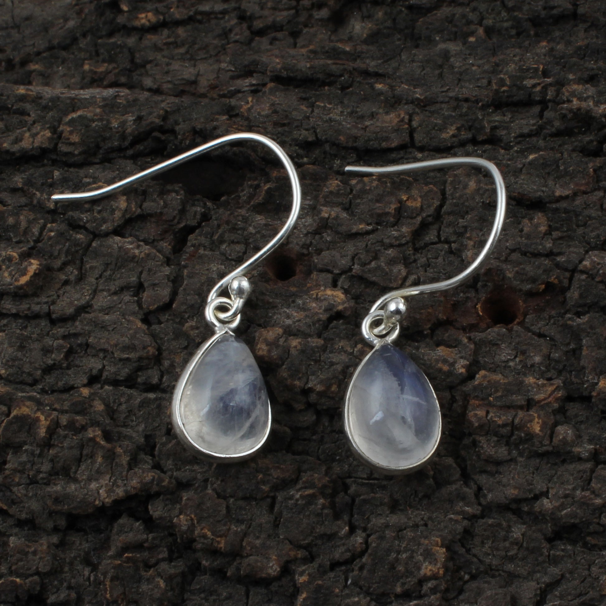 These handmade dangle earrings feature natural pear-shaped rainbow moonstone gemstones measuring 9x6mm, set in 925 sterling silver. With a refined size of 2.6 x 0.7 cm and a lightweight design of 1.87 grams, they offer both elegance and comfort. The moonstones display subtle white and rainbow hues, enhancing versatility for various occasions while showcasing expert craftsmanship.