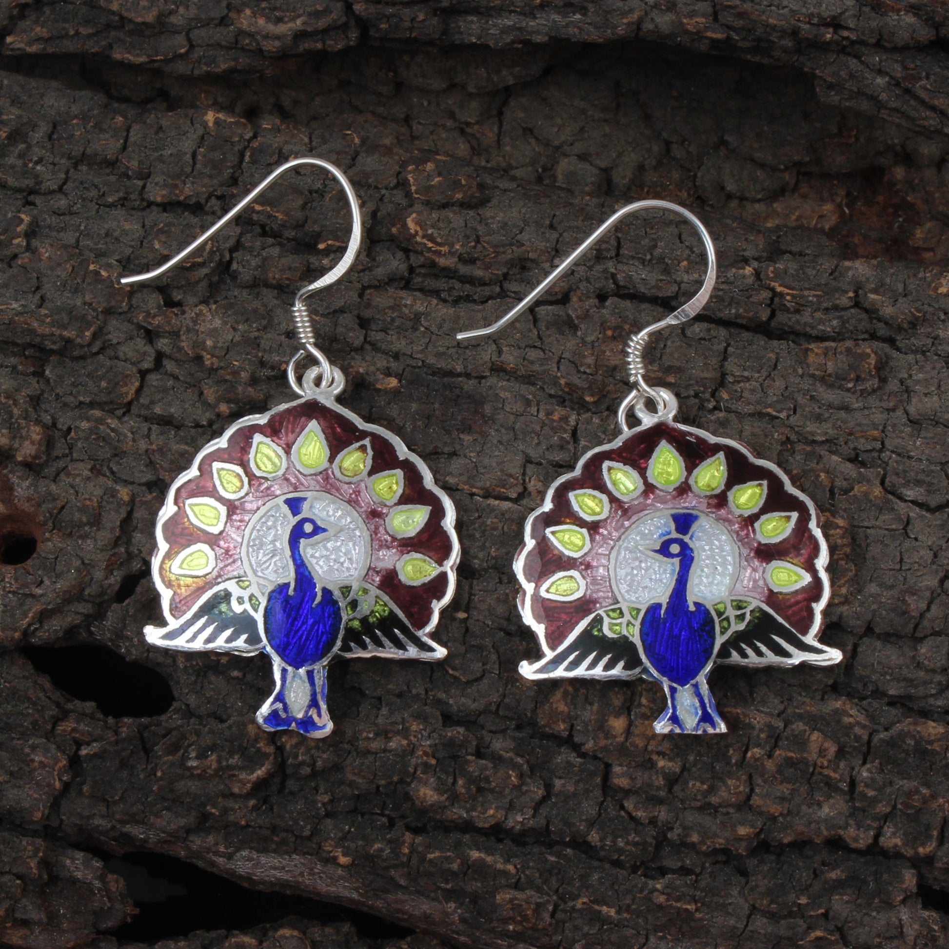 Peacock Enamel Silver Earrings Solid 925 Sterling Silver Dangle Earrings Ear Wire Colorful Enamel Earrings