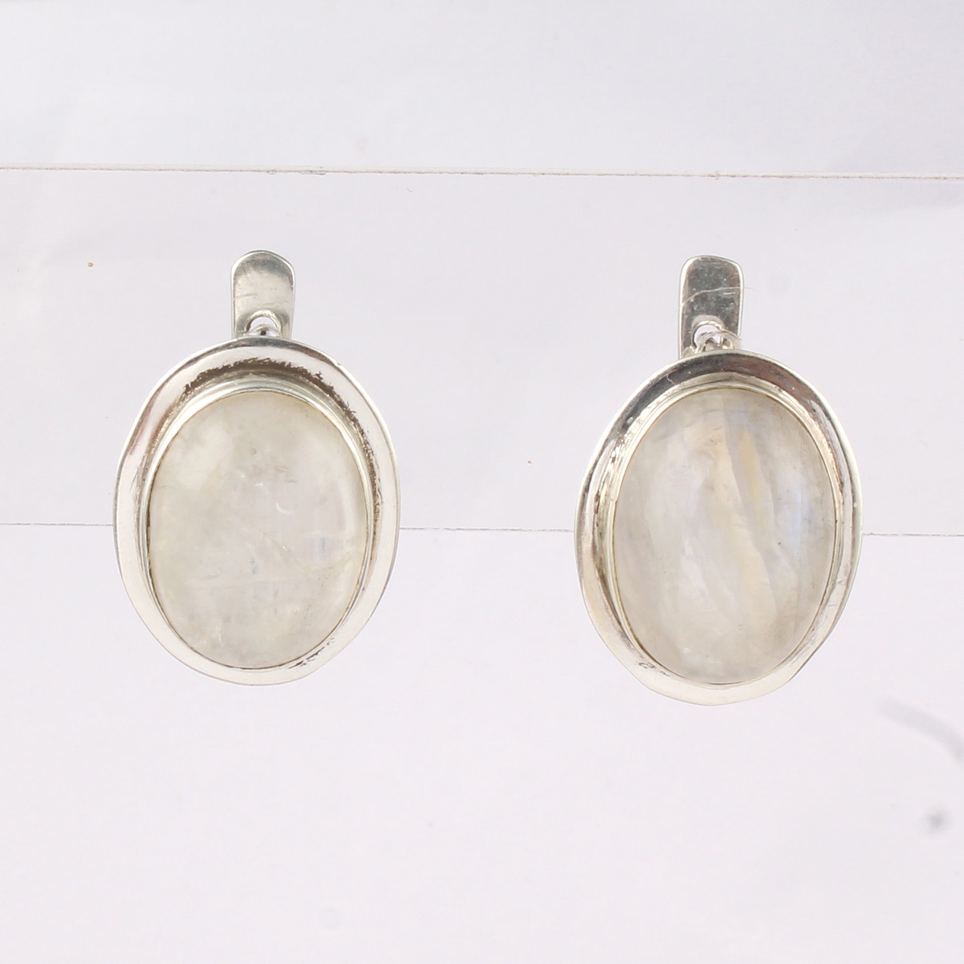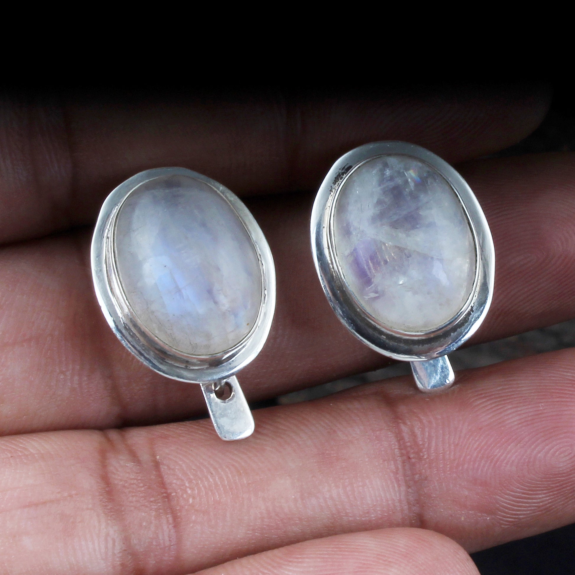 Crafted with precision, these handmade dangle earrings feature oval 16x12mm rainbow moonstones set in 925 sterling silver. Measuring 2 x 1.6 cm and weighing 8.41 grams, they combine elegance with durability. The moonstones exhibit a captivating play of color, adding a subtle yet striking glow to any ensemble, making them ideal for those who appreciate refined, artisan jewelry.