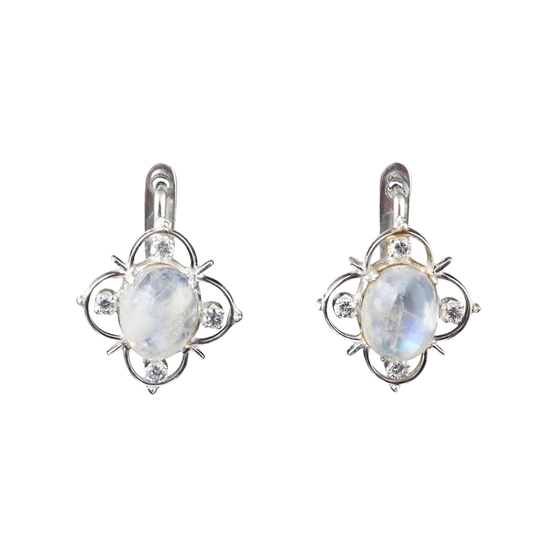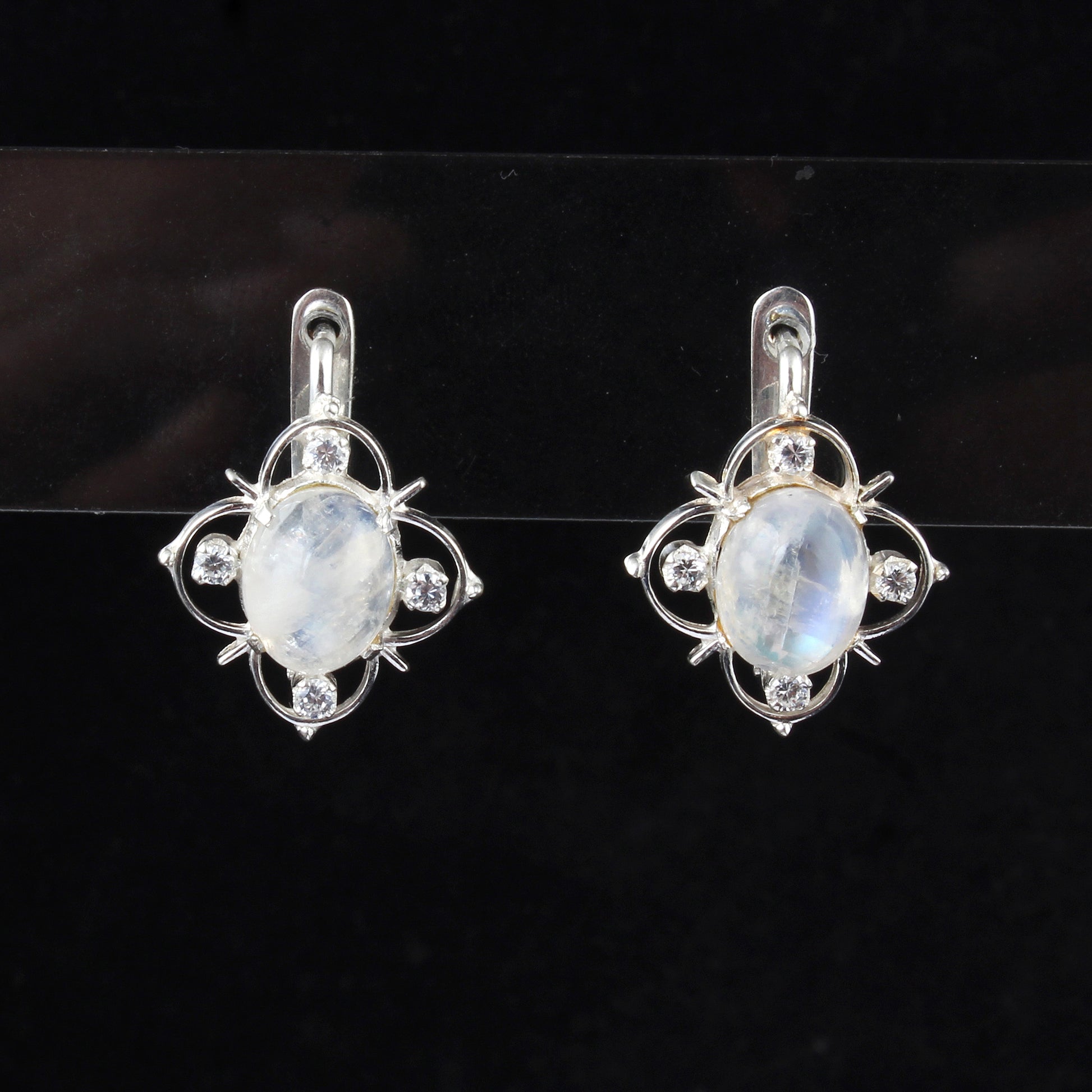 These Rainbow Moonstone earrings feature 10x8mm oval gemstones set in carefully handcrafted 925 sterling silver, accented with CZ stones for added sparkle. Measuring 2.2 x 1.7 cm and weighing 3.06 grams, they offer a lightweight yet durable design ideal for daily wear. The natural glow of the moonstones combined with expertly set cubic zirconia creates an elegant accessory that complements both casual and formal attire.