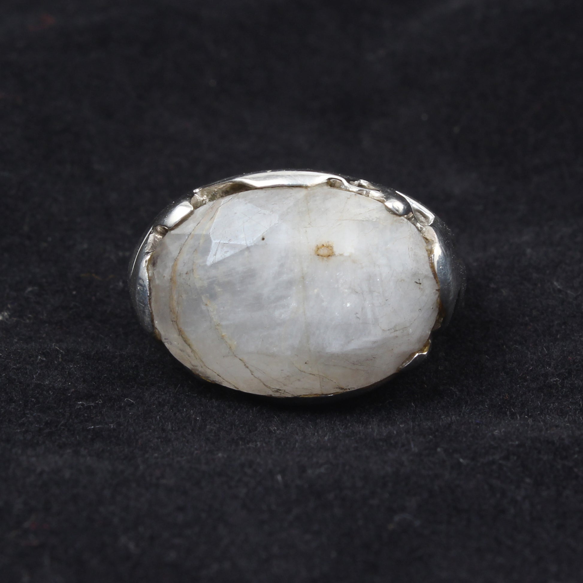 Crafted from authentic 925 sterling silver, this designer openwork ring features a natural rainbow moonstone measuring 20x15mm. Weighing 12.65 grams, the piece combines elegance with durability, showcasing the moonstone's subtle iridescence within a detailed silver framework. Ideal for connoisseurs seeking a unique statement accessory, this ring balances craftsmanship and natural beauty with expert precision.