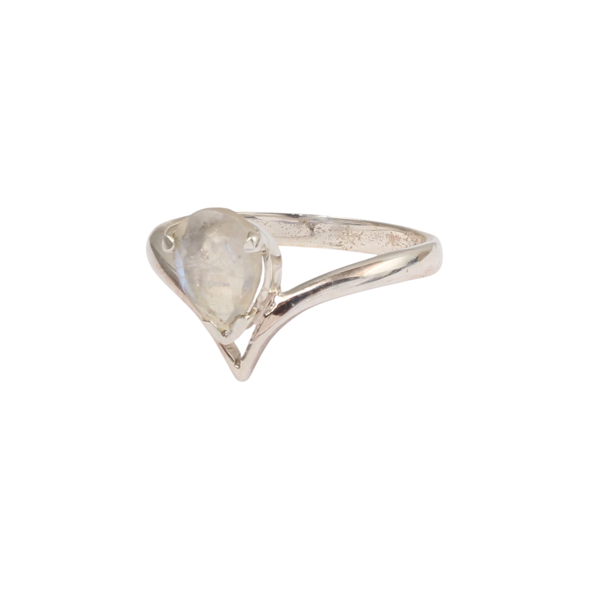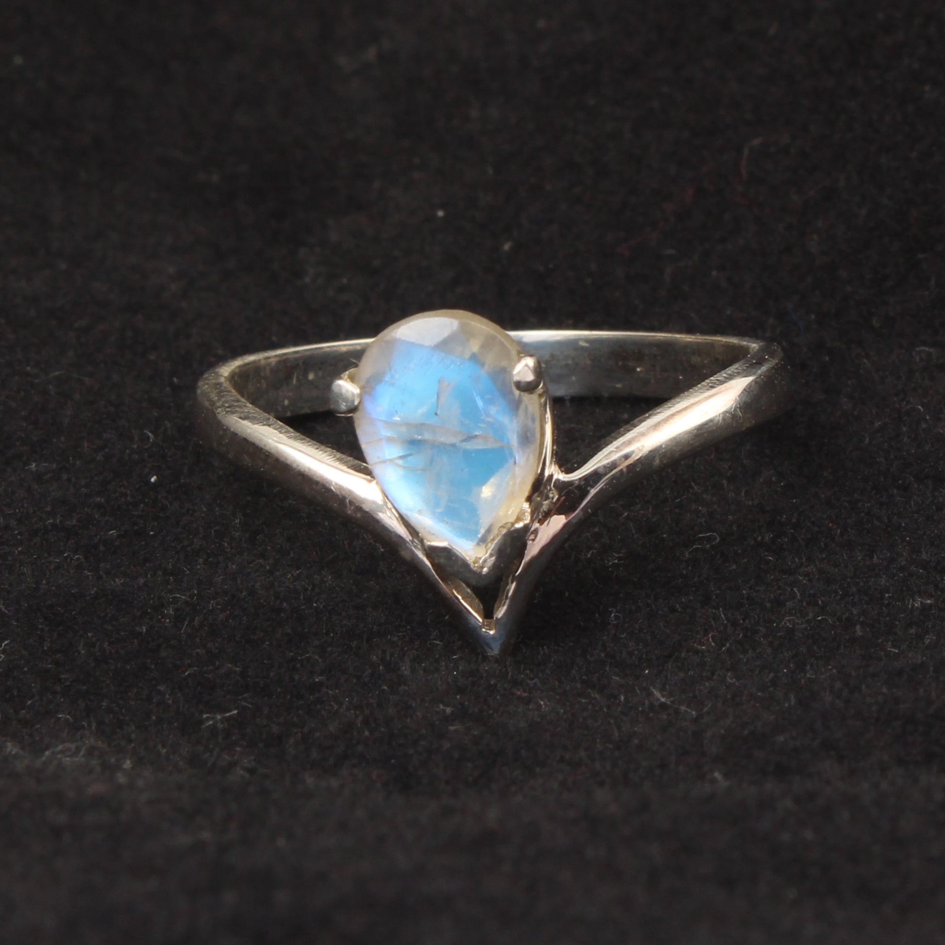 This expertly crafted ring features a 10x7mm faceted pear-shaped Rainbow Moonstone, delicately set in a prong setting to highlight its natural luminescence. Made from high-quality 925 sterling silver, the V-Chevron design combines elegance and durability. Weighing 2.58 grams, this handmade piece offers both refined aesthetics and lasting wear, making it an excellent addition for collectors and admirers of fine gemstone jewelry.