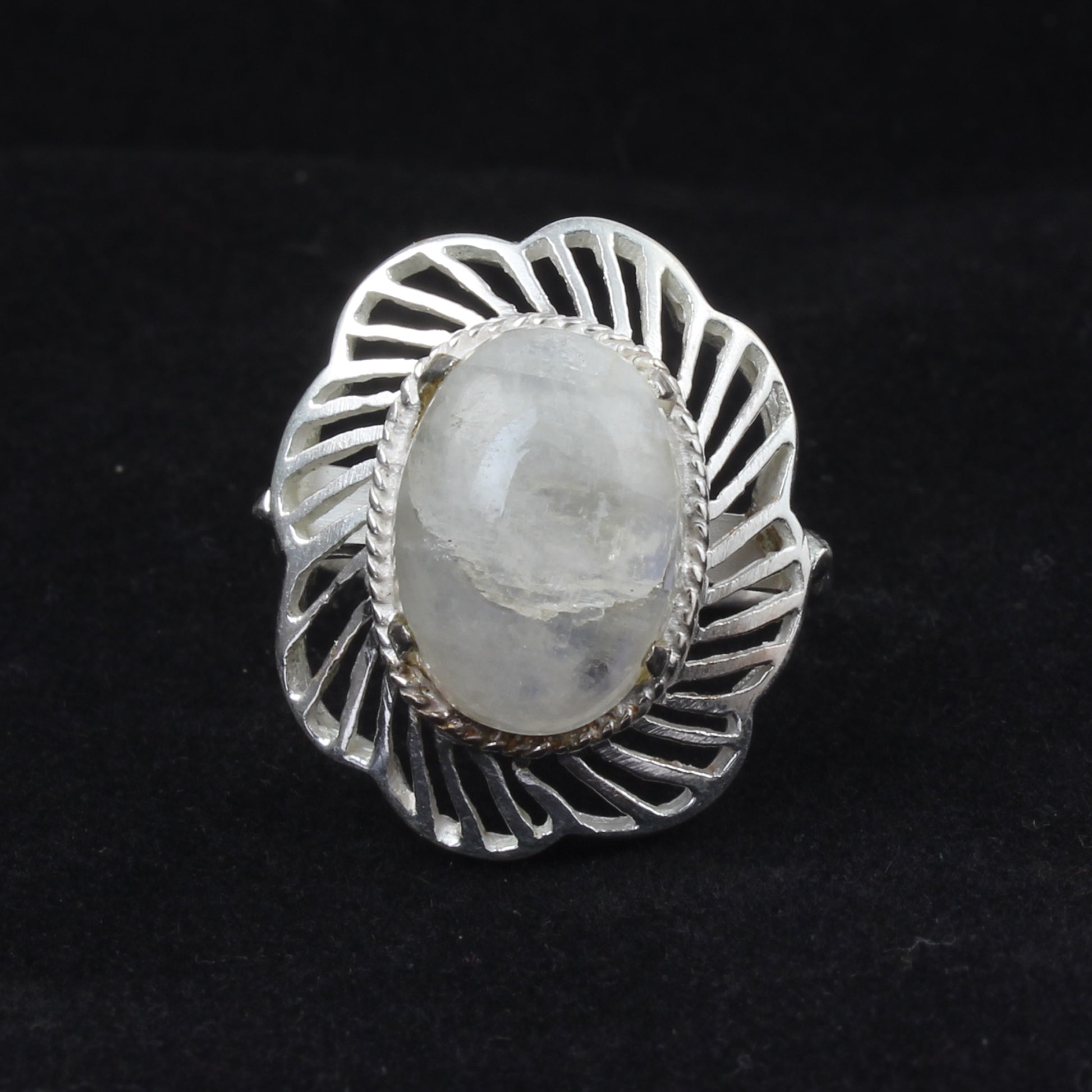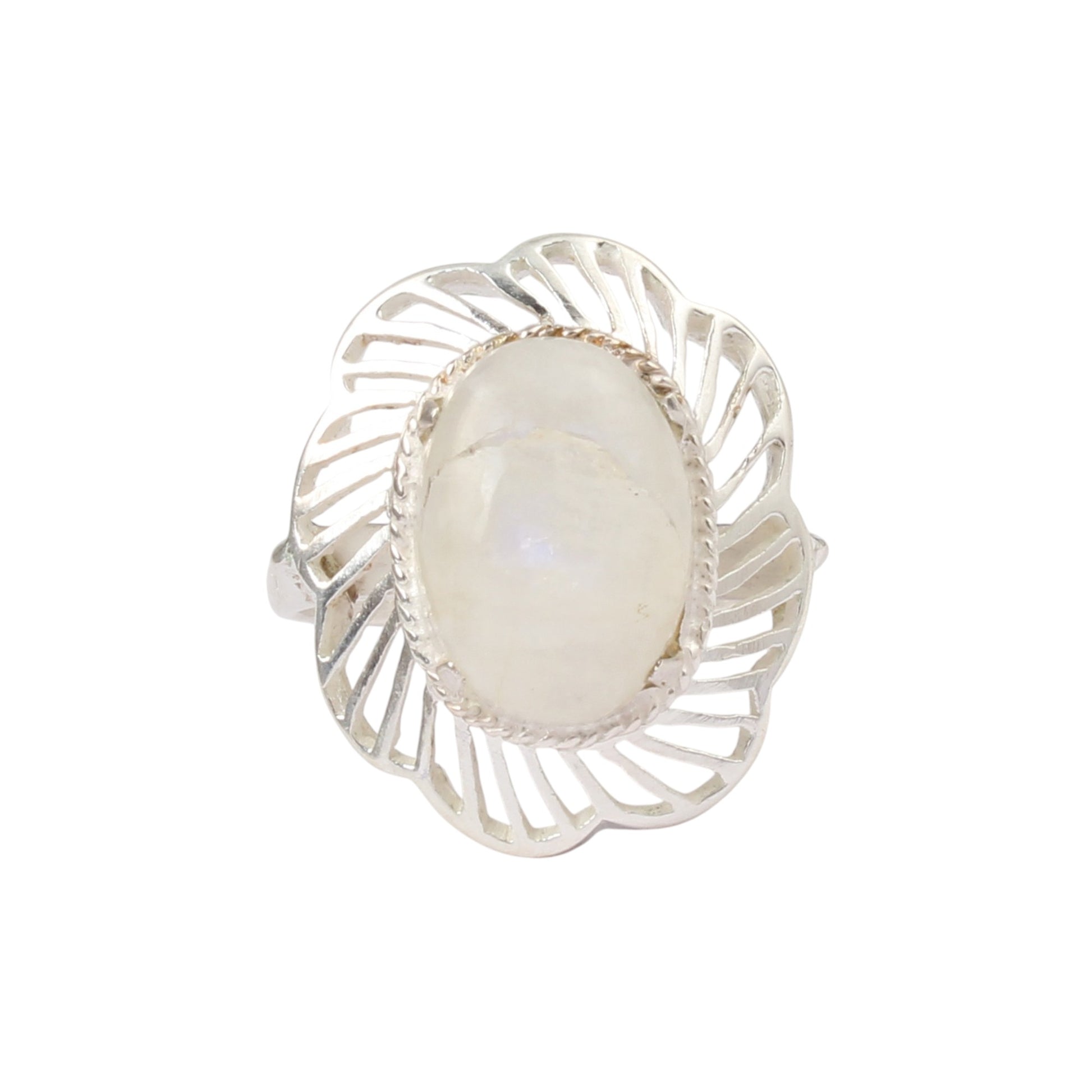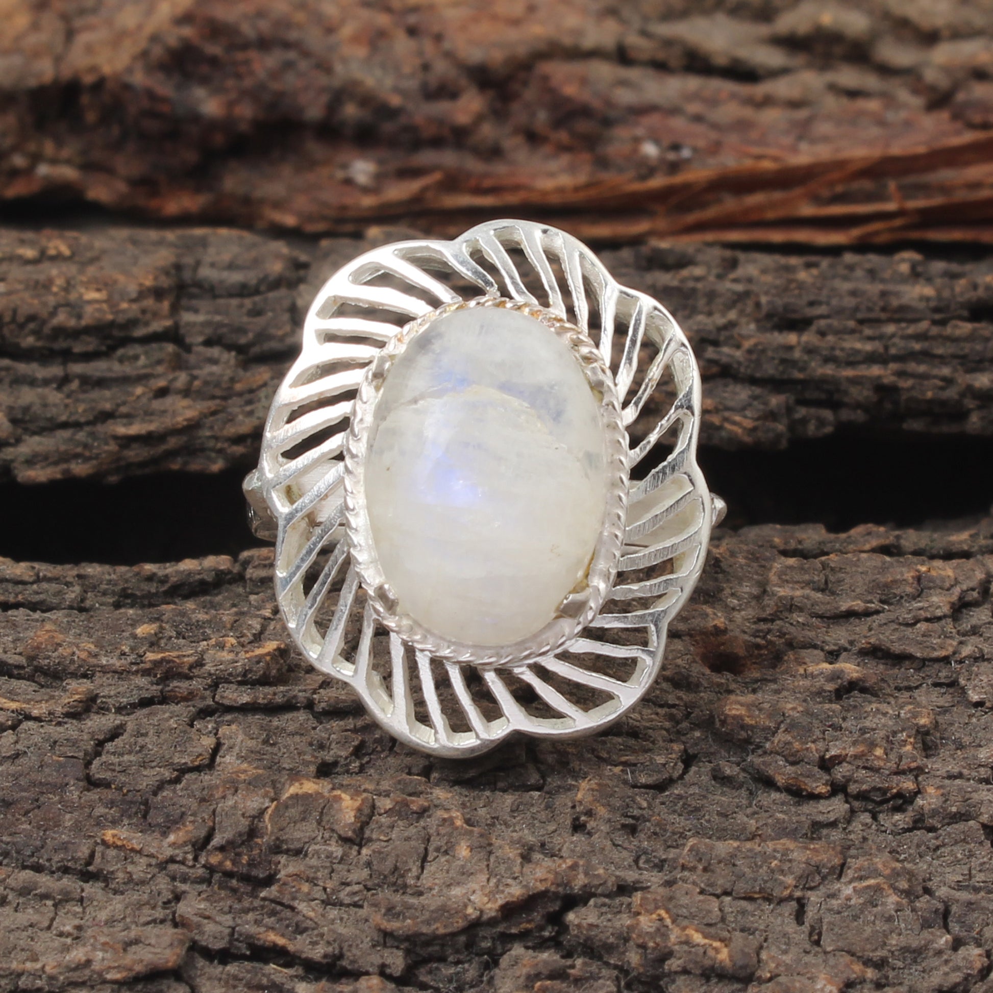 Retro Floral Rainbow Moonstone Ring 925 Sterling Silver Natural Oval Gemstone Prong Setting Ring