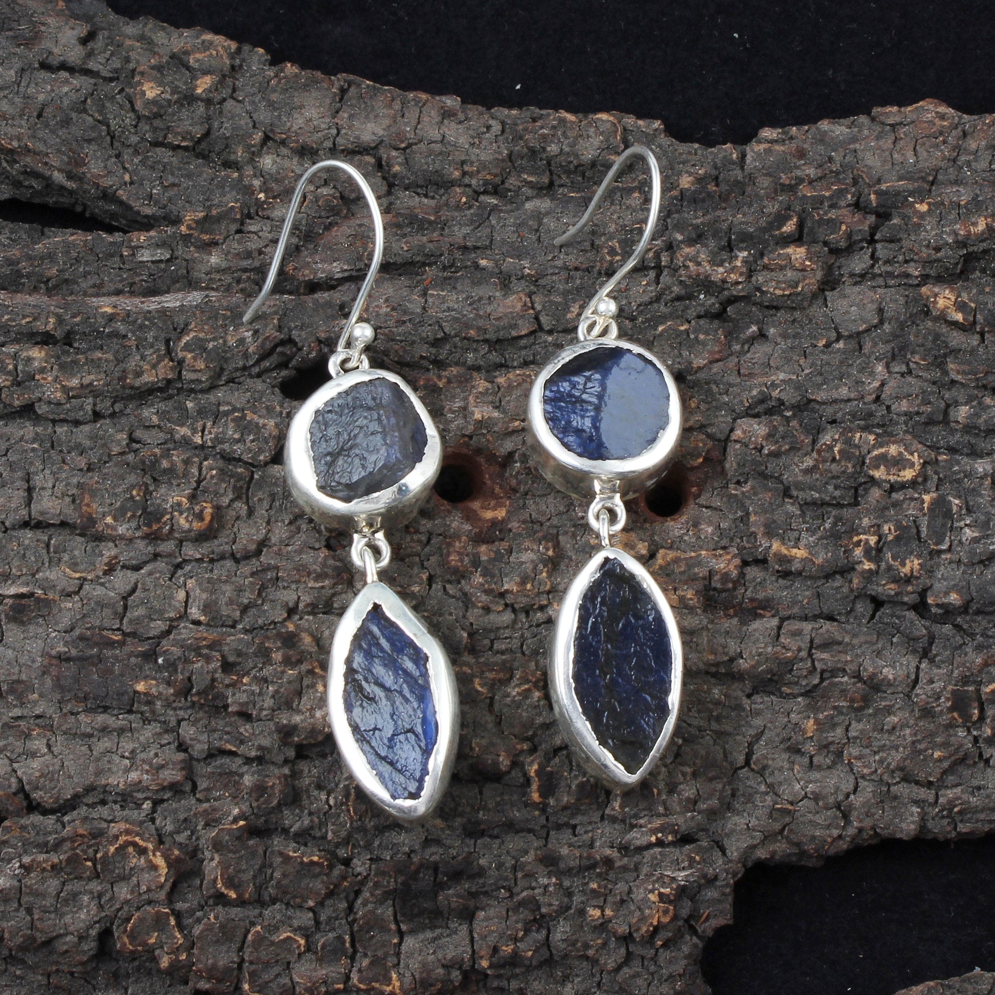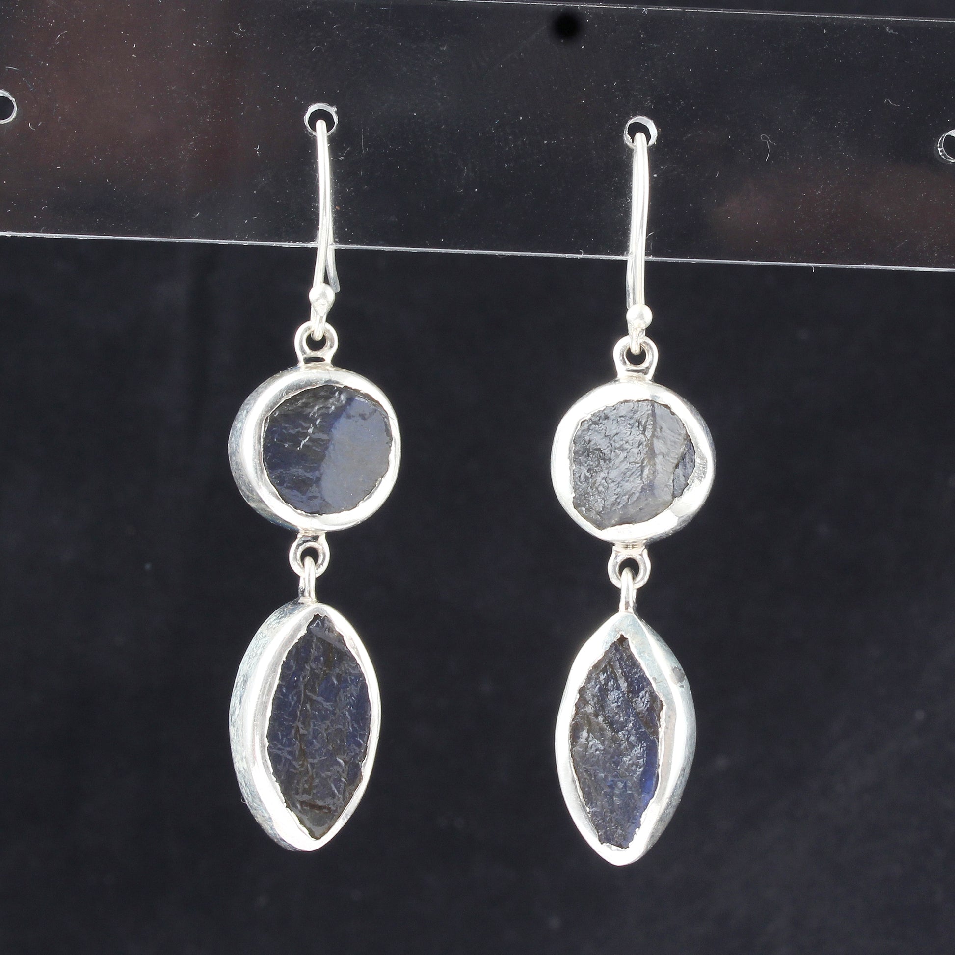 These handcrafted dangle earrings feature natural rough labradorite gemstones set in 925 sterling silver, measuring 5.4 x 1.3 cm and weighing 14.62 grams. The unique labradorite stones showcase striking iridescence, making each piece distinct. Lightweight yet substantial, these earrings provide both elegance and durability, perfect for those seeking artisanal jewelry with a refined, natural touch.