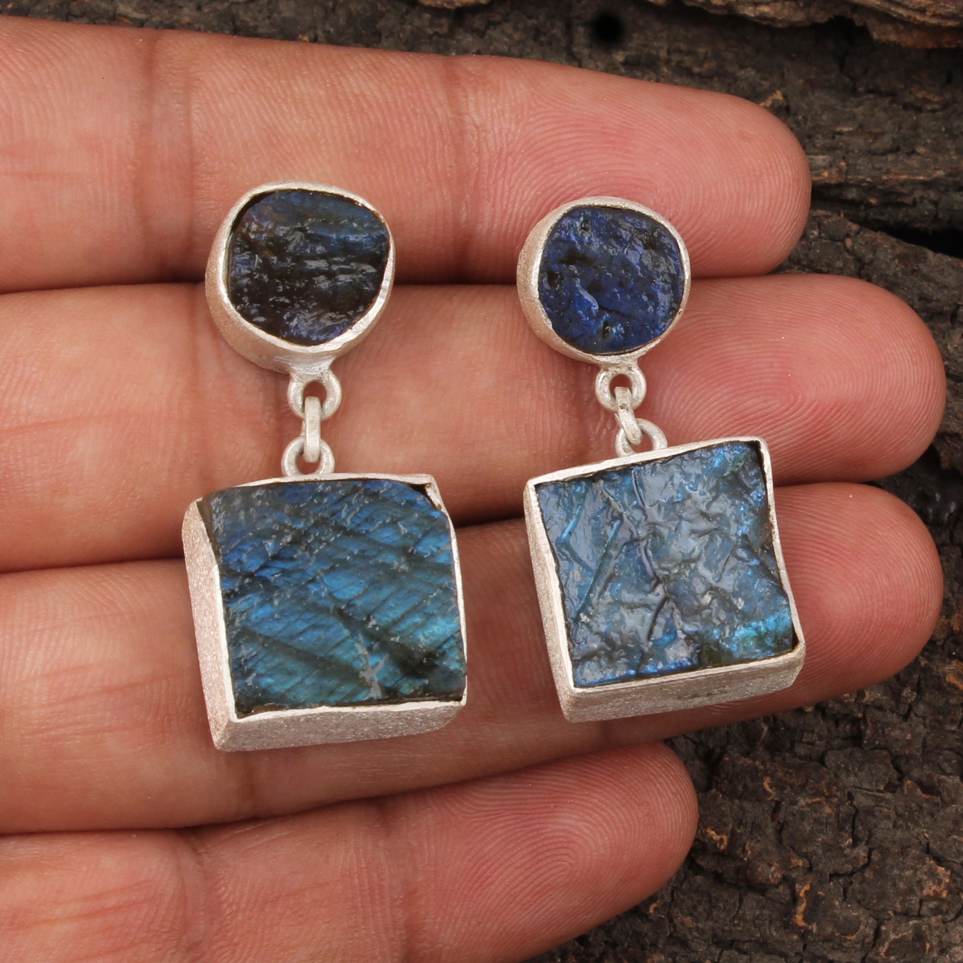 These handmade earrings feature natural rough labradorite stones, measuring 16mm by 10mm, set in a matte-finish 925 sterling silver frame. With dimensions of 3.7 by 1.7 cm and weighing 22.28 grams, they combine artisanal craftsmanship with the unique allure of raw gemstones, offering a sophisticated accessory that highlights the stone’s natural beauty and iridescent qualities. Perfect for those seeking an elegant yet earthy statement piece.