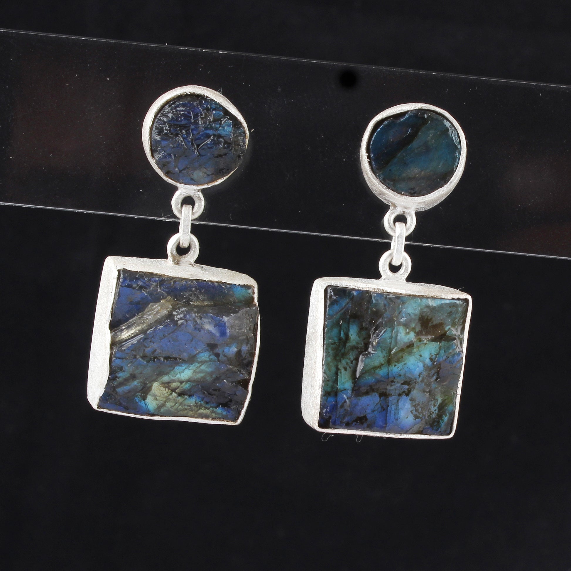 These handcrafted earrings feature natural rough labradorite gemstones set in 925 sterling silver with a matte finish. Measuring 3.5 x 1.7 cm, each earring showcases a 17mm by 10mm labradorite stone, offering unique raw beauty. Weighing 21.92 grams, this expert-crafted jewelry piece combines natural elegance with artisan workmanship, making it a distinctive addition to any collection.