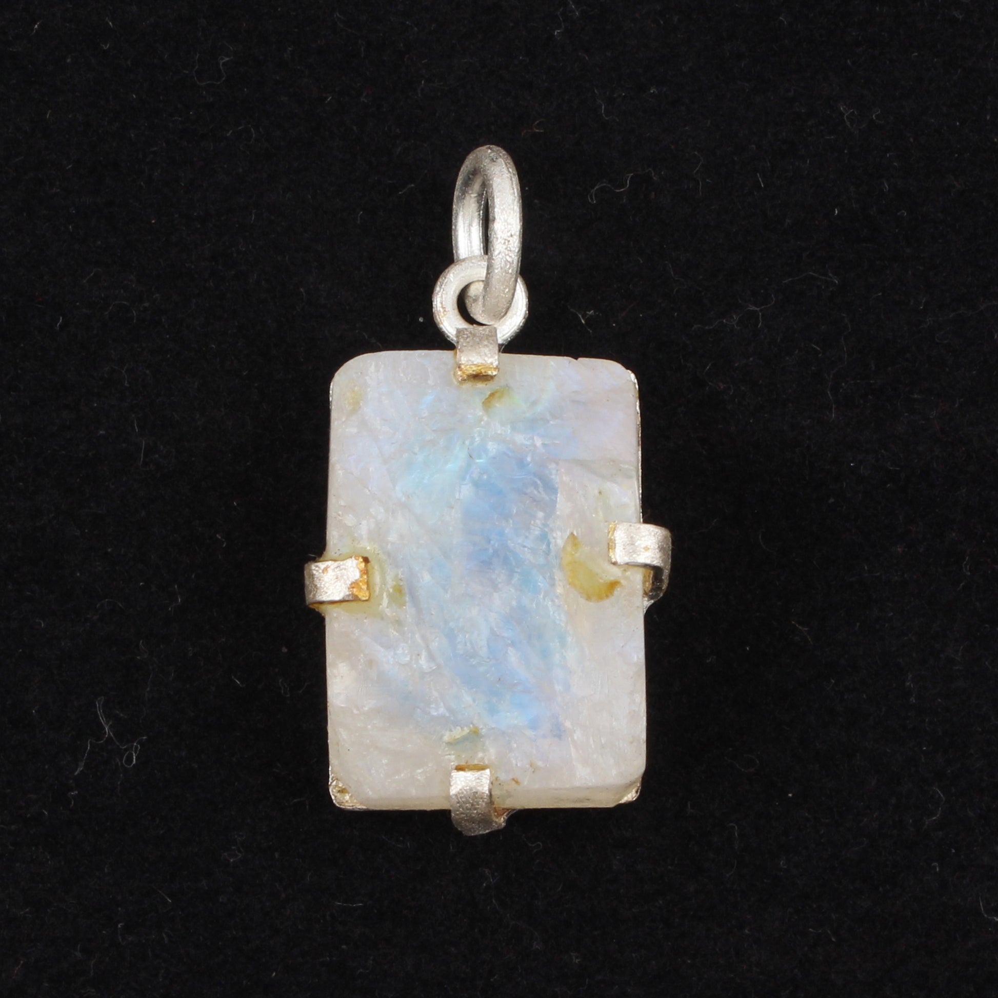 This rectangular Rough Rainbow Moonstone pendant, measuring 35x18mm and weighing 12 grams, is expertly handcrafted with a 925 sterling silver prong setting. The natural gemstone showcases subtle flashes of iridescent color, adding a refined elegance to any collection. Its durable yet delicate design ensures lasting wear, making it a sophisticated choice for those who appreciate both the beauty and authenticity of genuine gemstones.