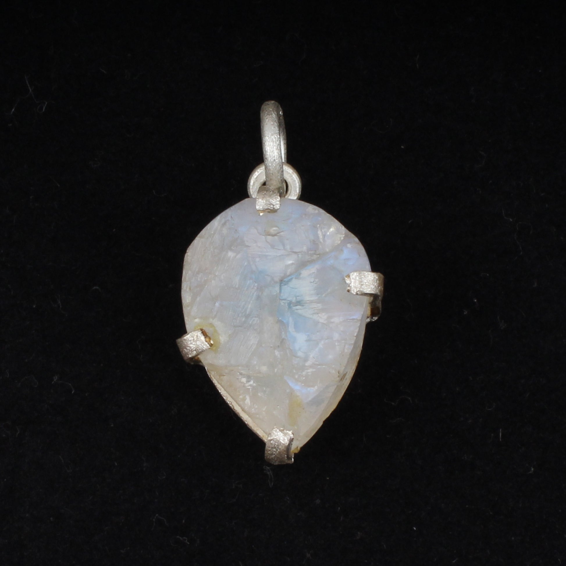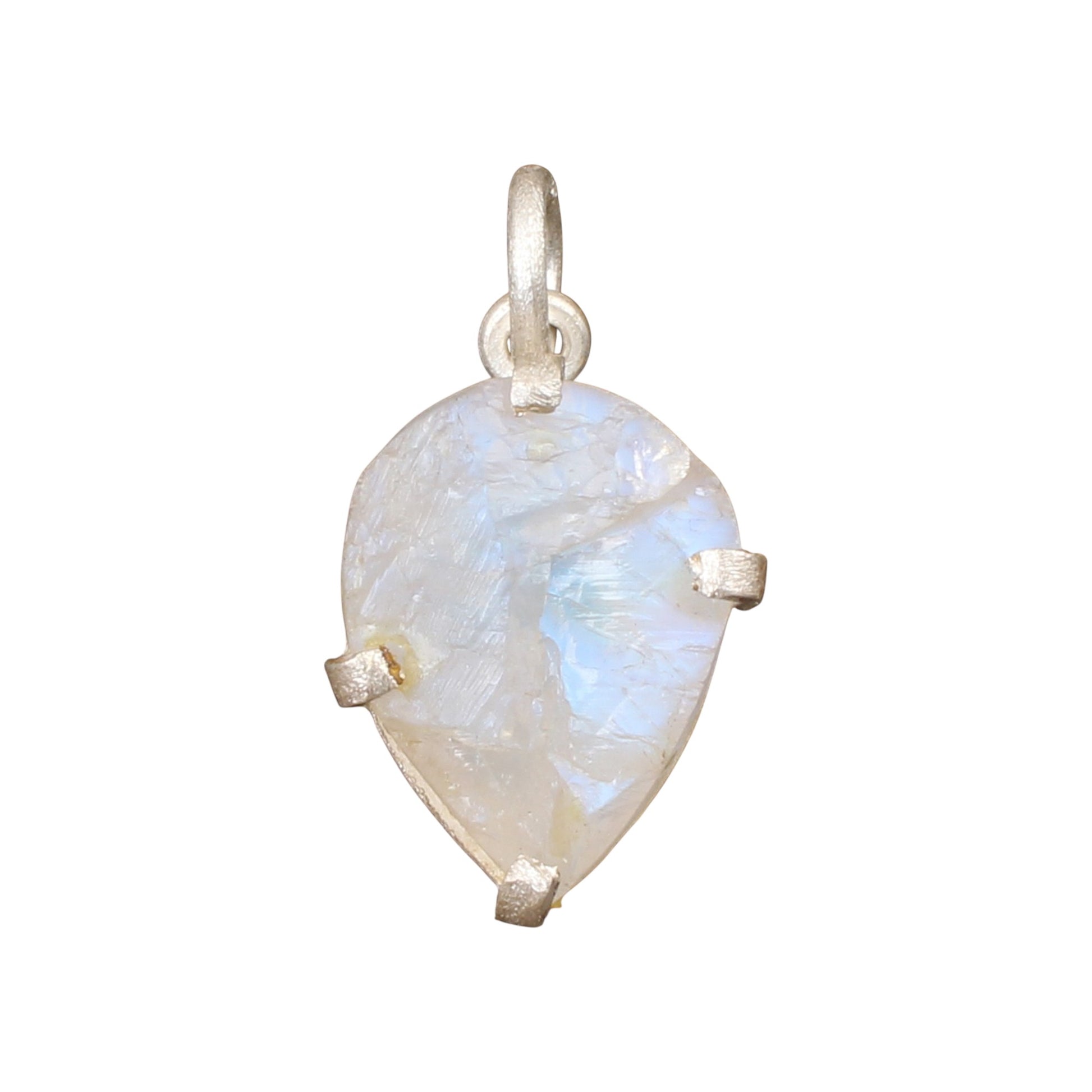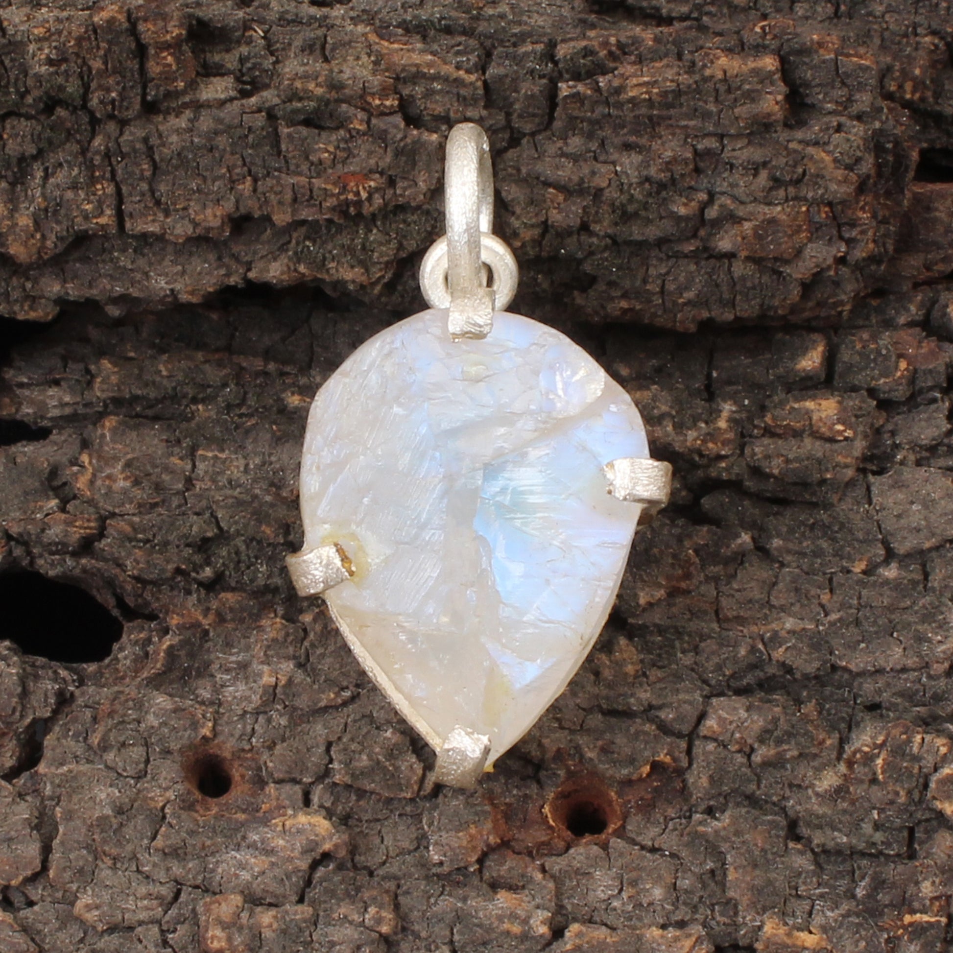This expert-crafted pendant features a natural rough Rainbow Moonstone shaped into a 33x18mm pear form, set securely in a 925 sterling silver prong setting. Weighing 9.48 grams, this pendant highlights the stone’s unique raw beauty and subtle iridescence, making it a striking addition to any fine jewelry collection. Ideal for those seeking a blend of natural elegance and expert craftsmanship.