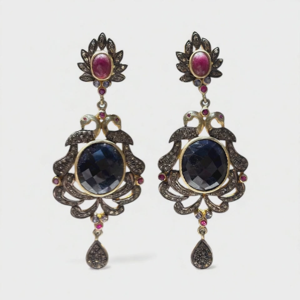 92.5 sterling silver victorian sapphire earring with diamonds and ruby These exquisite Victorian earrings feature genuine sapphires, rubies, and diamonds, all set in 92.5 sterling silver. You'll love the elegant and timeless design, and the traditional craftsmanship ensures long-lasting quality. The perfect accessory for adding a touch of luxury to any outfit.