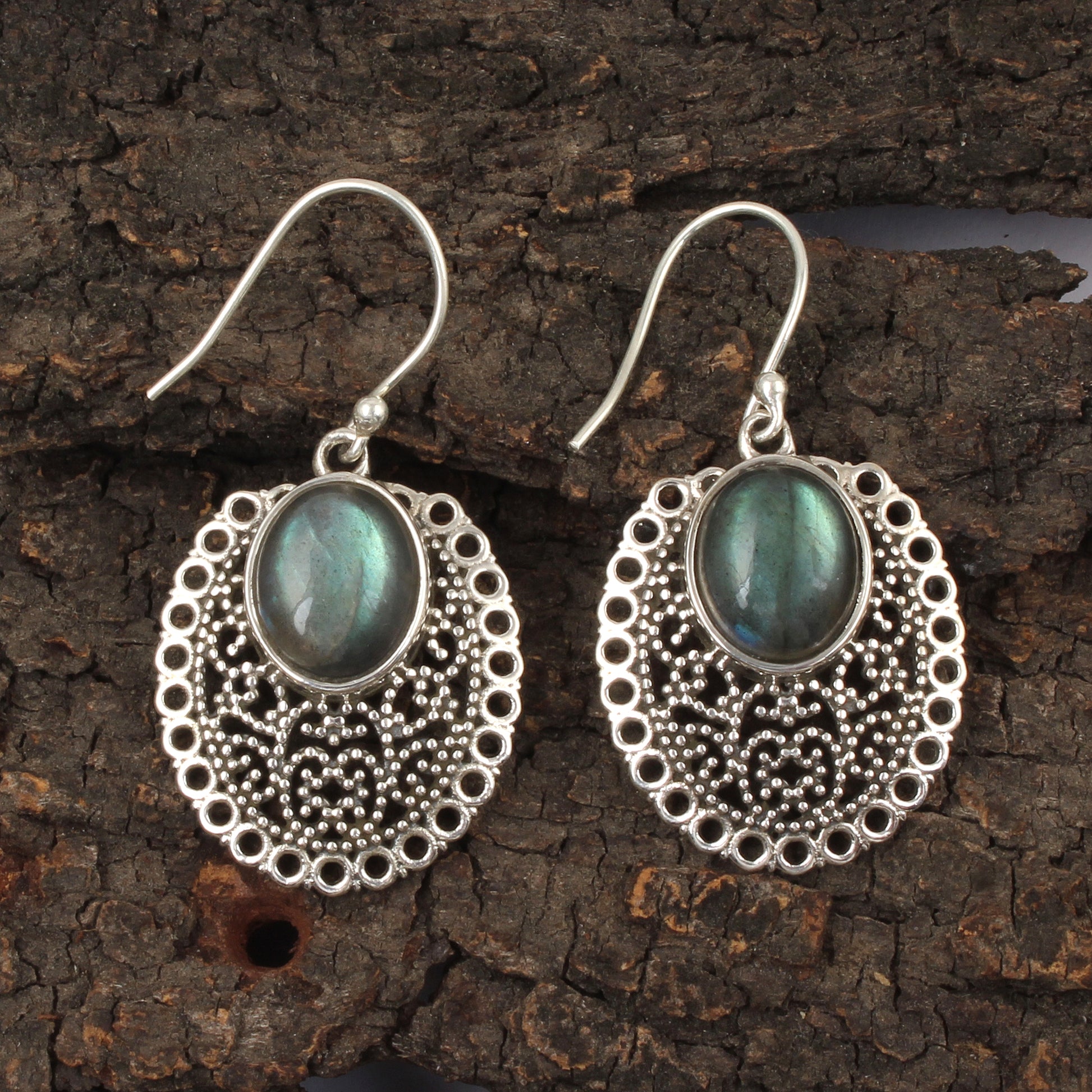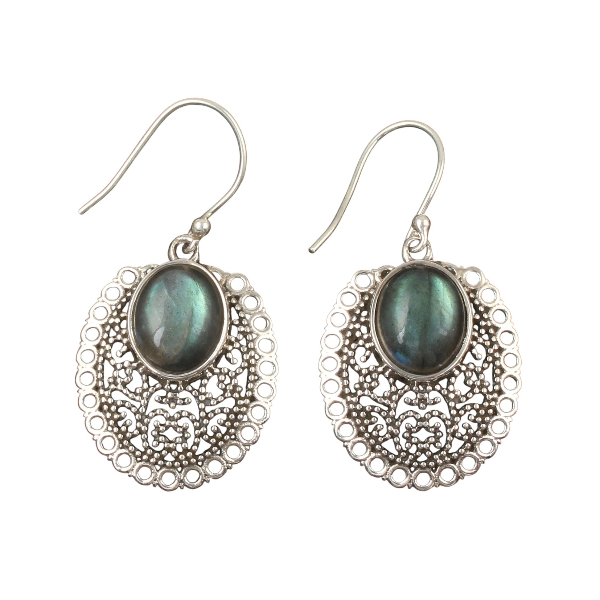 Crafted with precision, these traditional Labradorite earrings showcase natural 11x9mm oval gemstones set in 925 sterling silver. Measuring 3.8 x 2 cm and weighing 7.1 grams, they blend artisanal craftsmanship with durability. The unique play of colors in Labradorite adds a sophisticated touch, making these handmade earrings a distinguished accessory for connoisseurs of fine jewelry.